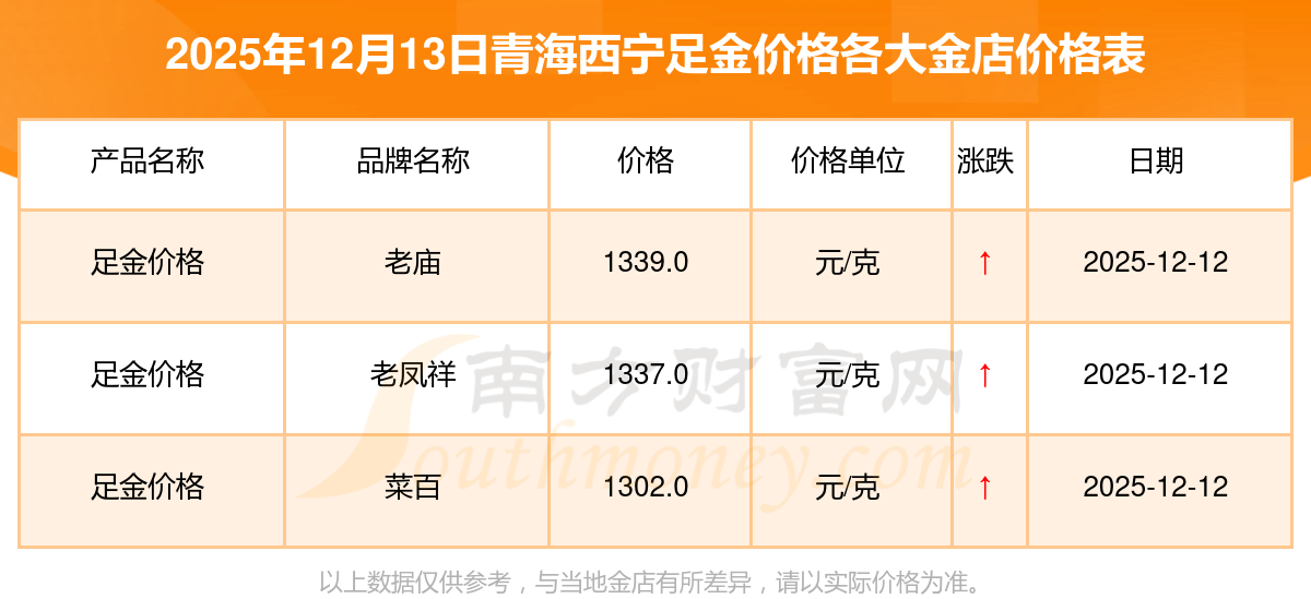2025年12月13日青海西宁周大福、周大福、老凤祥、老凤祥、老庙、老庙、周生生、周生生、周大福、周大福、周大福等各大金店品牌足金价格最新价格如下:周大福黄金价格1336.0元/克,周大福铂金价格681.0元/克,老凤祥黄金价格1337.0元/克,老凤祥铂金价格650.0元/克,老庙黄金价格1339.0元/克,老庙铂金价格600.0元/克,周生生黄金价格1338.0元/克,周生生铂金价格681.0元/克,周大福饰品金价(内地)1336.0元/克,周大福黄金饰品(香港)47410.0,周大福铂金价格(香港)19550.0。