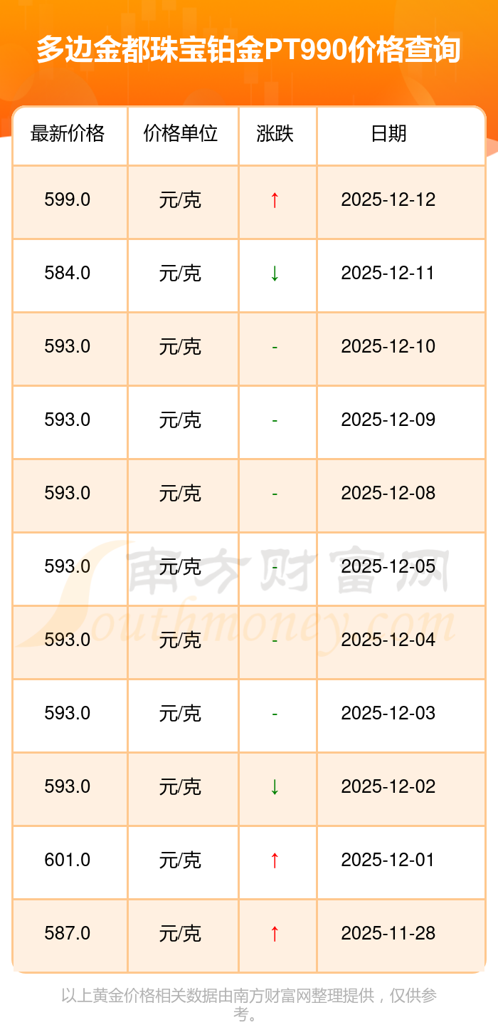 599.0元/克成为多边金都珠宝今日 铂金PT990的最新交易的价格。