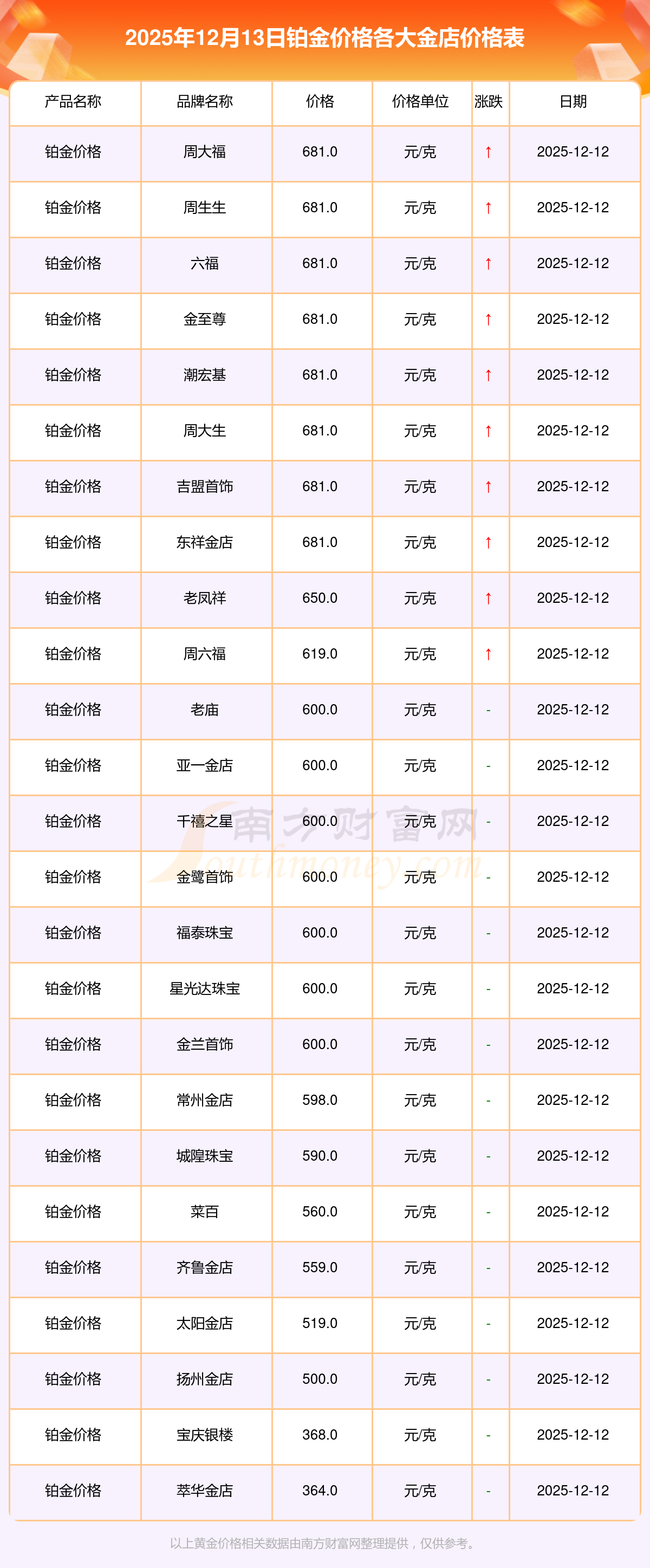 2025年12月13日,周大福、周大福、老凤祥、老凤祥、老庙、老庙、周生生、周生生、周大福、周大福、周大福等各大金店品牌铂金价格今日价格如下:周大福1336.0元/克、周大福681.0元/克、老凤祥1337.0元/克、老凤祥650.0元/克、老庙1339.0元/克、老庙600.0元/克、周生生1338.0元/克、周生生681.0元/克、周大福1336.0元/克、周大福47410.0、周大福19550.0。