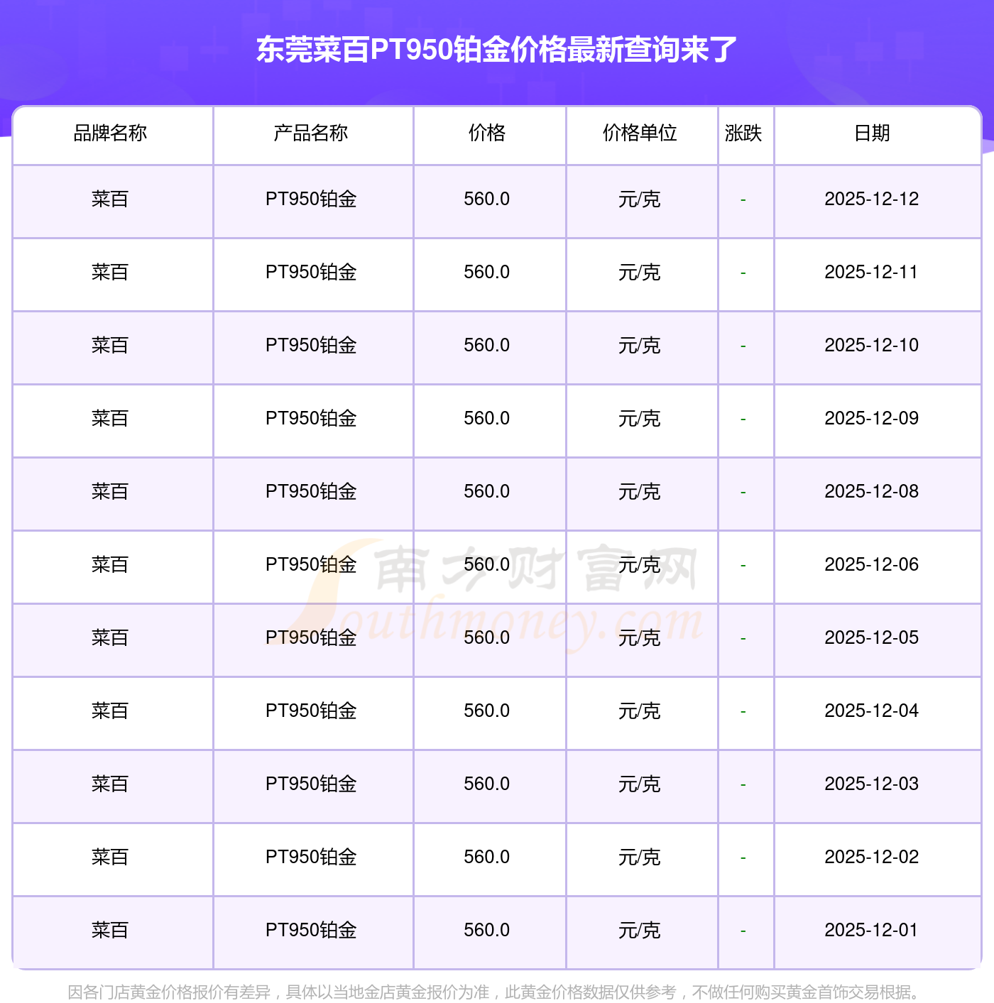 2025年12月13日,今日东莞菜百PT950铂金价格:560.0元/克。