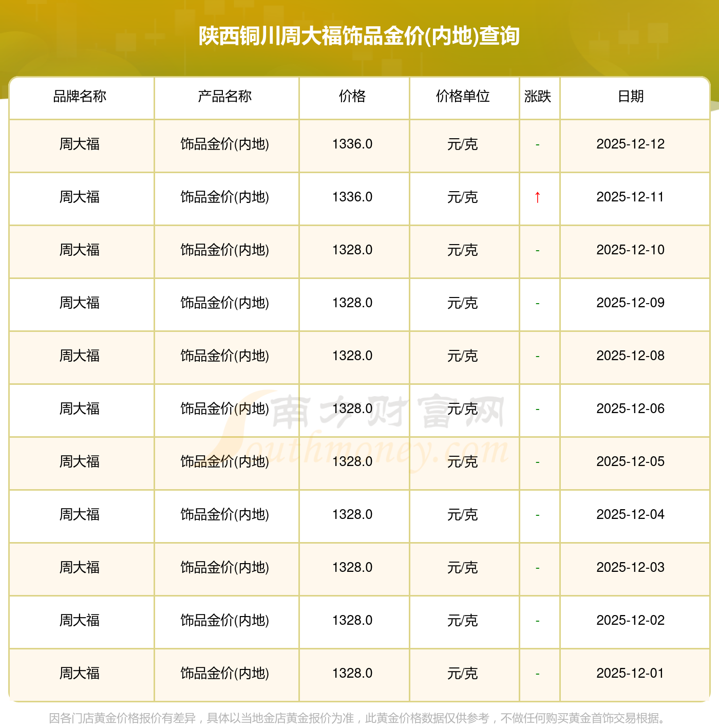 今日(2025年12月14日),1336.0元/克是陕西铜川周大福饰品金价(内地)的价格标准。