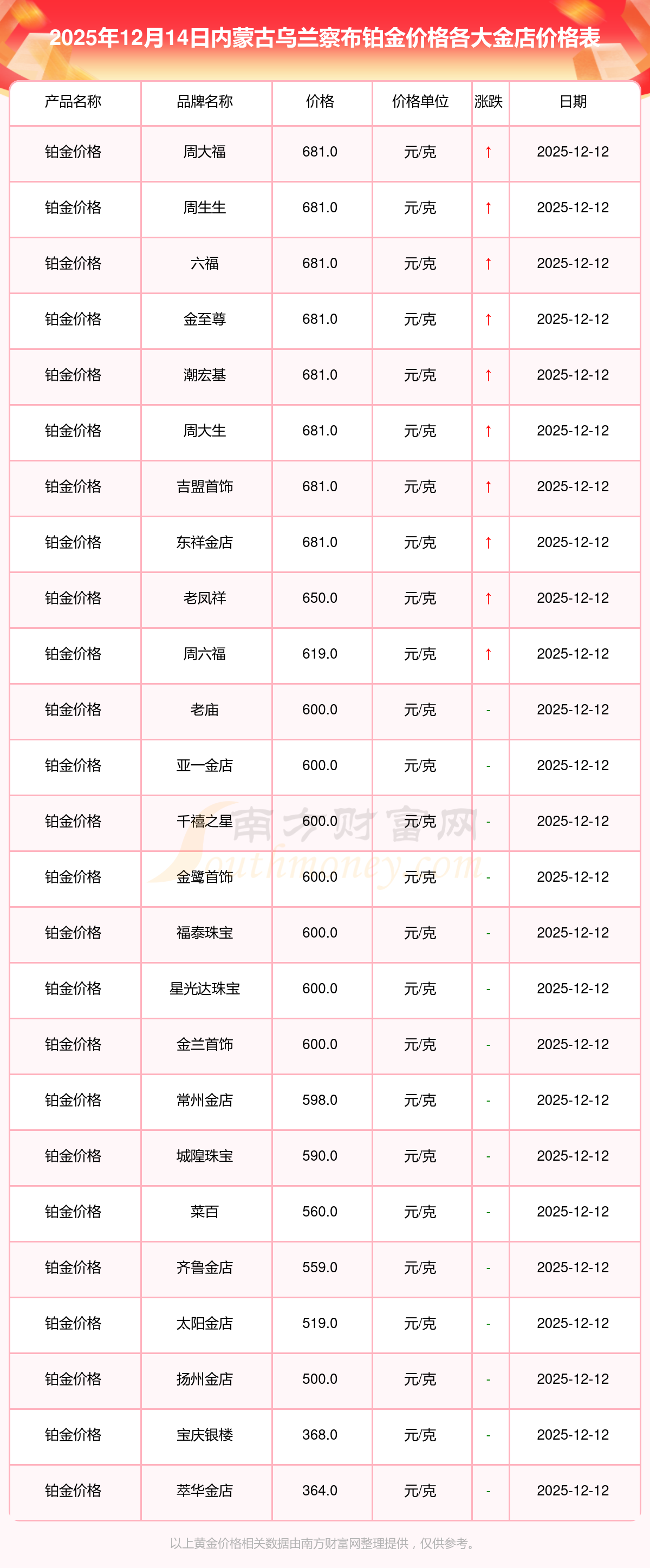 2025年12月14日内蒙古乌兰察布周大福、周大福、老凤祥、老凤祥、老庙、老庙、周生生、周生生、周大福、周大福、周大福等各大金店品牌铂金价格最新价格如下:周大福黄金价格1336.0元/克,周大福铂金价格681.0元/克,老凤祥黄金价格1337.0元/克,老凤祥铂金价格650.0元/克,老庙黄金价格1339.0元/克,老庙铂金价格600.0元/克,周生生黄金价格1338.0元/克,周生生铂金价格681.0元/克,周大福饰品金价(内地)1336.0元/克,周大福黄金饰品(香港)47410.0,周大福铂金价格(香港)19550.0。