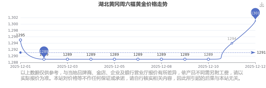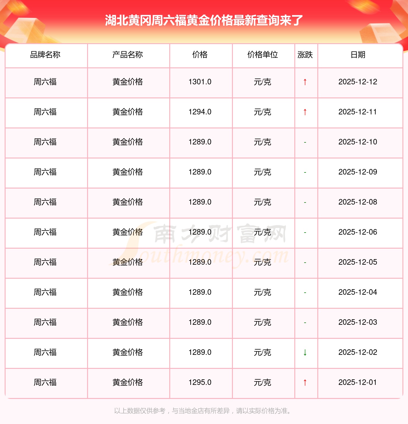 今日(2025年12月14日),湖北黄冈周六福黄金价格每克的价值为1301.0元/克。