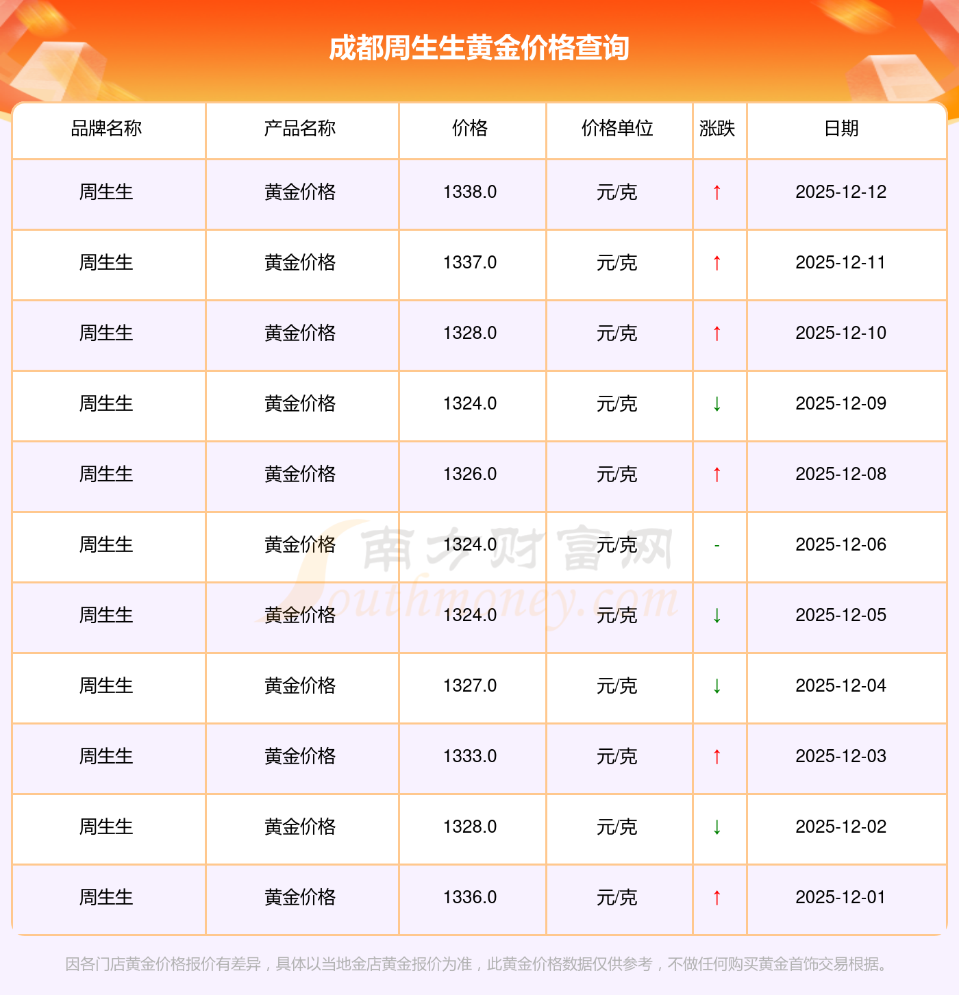 成都周生生黄金价格在 2025年12月14日,其市场价格为 1338.0元/克。