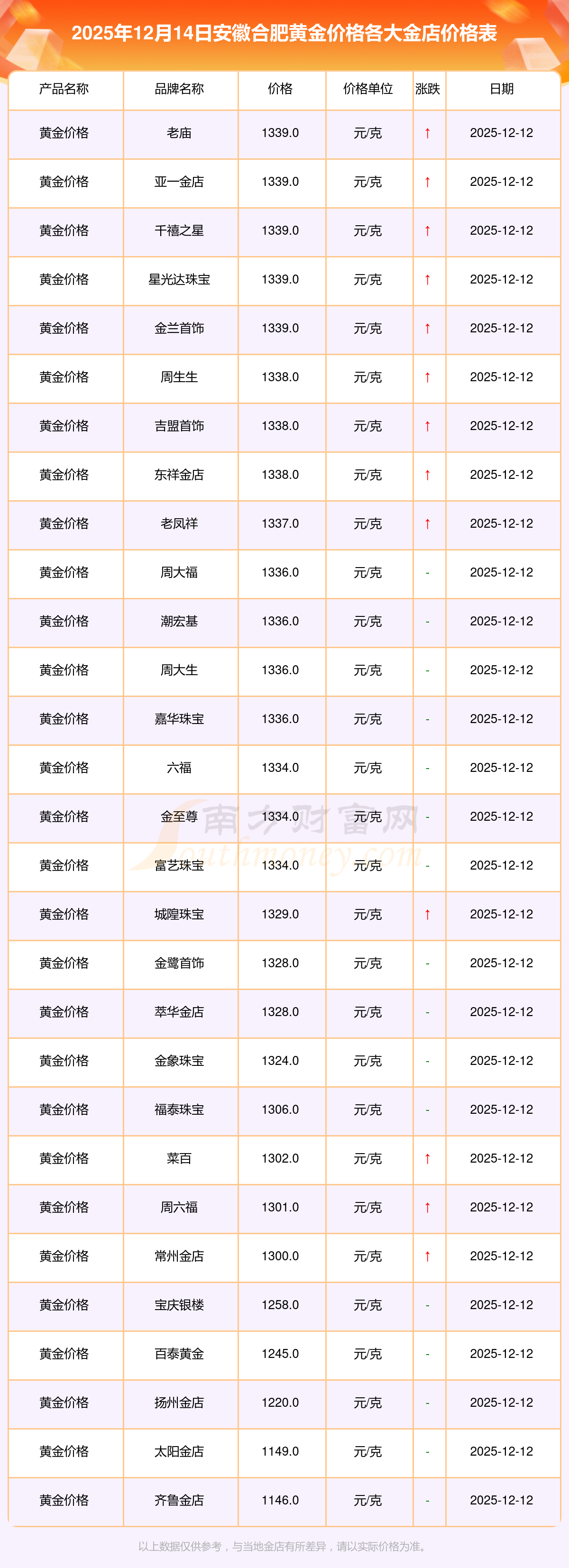 2025年12月14日,安徽合肥周大福、周大福、老凤祥、老凤祥、老庙、老庙、周生生、周生生、周大福、周大福、周大福等各大金店品牌黄金价格今日价格行情最新来了:周大福1336.0元/克、周大福681.0元/克、老凤祥1337.0元/克、老凤祥650.0元/克、老庙1339.0元/克、老庙600.0元/克、周生生1338.0元/克、周生生681.0元/克、周大福1336.0元/克、周大福47410.0、周大福19550.0。