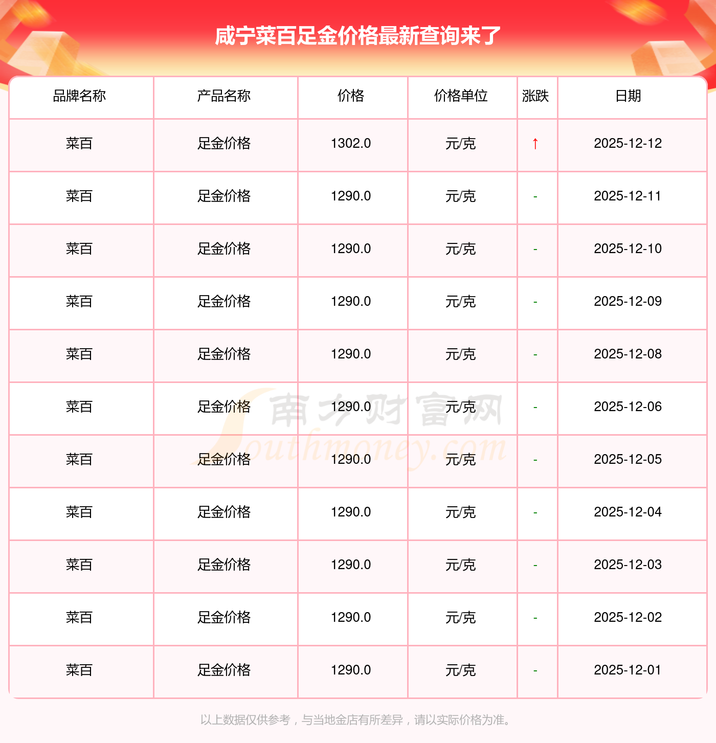 2025年12月14日,咸宁菜百所售足金价格,其价格设定为 1302.0元/克。