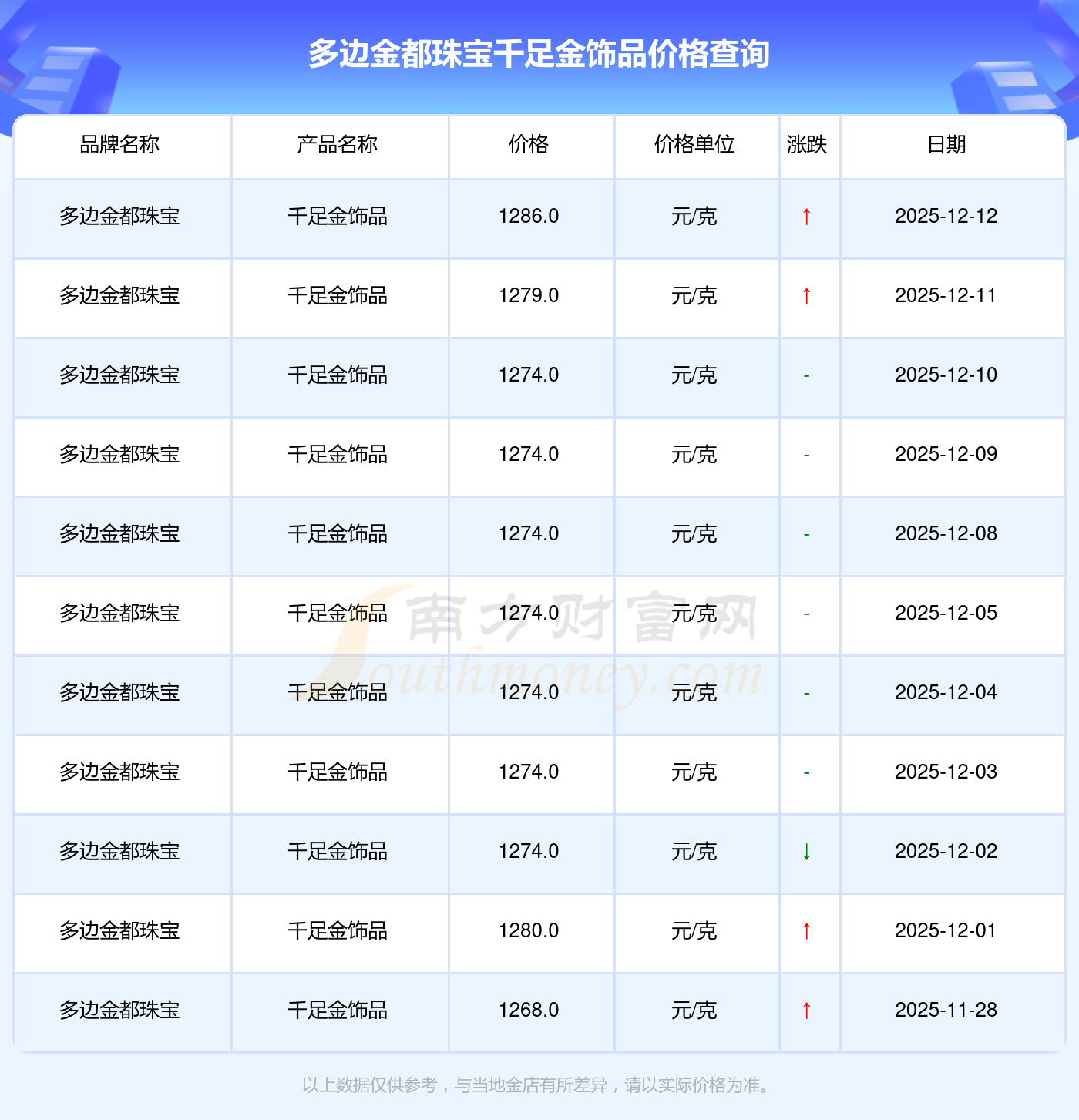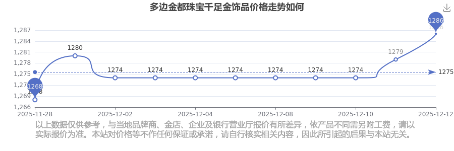 据了解,多边金都珠宝今日千足金饰品价格为1286.0元/克。