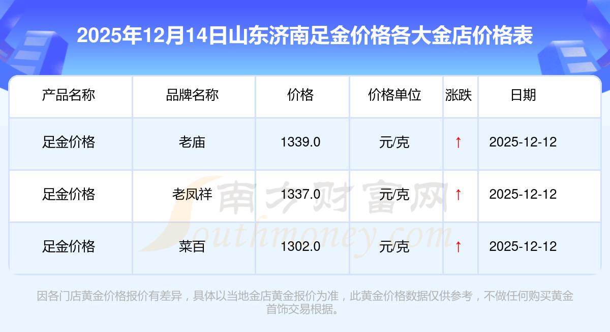 2025年12月14日山东济南周大福、周大福、老凤祥、老凤祥、老庙、老庙、周生生、周生生、周大福、周大福、周大福等各大金店品牌足金价格最新价格如下:周大福黄金价格1336.0元/克,周大福铂金价格681.0元/克,老凤祥黄金价格1337.0元/克,老凤祥铂金价格650.0元/克,老庙黄金价格1339.0元/克,老庙铂金价格600.0元/克,周生生黄金价格1338.0元/克,周生生铂金价格681.0元/克,周大福饰品金价(内地)1336.0元/克,周大福黄金饰品(香港)47410.0,周大福铂金价格(香港)19550.0。