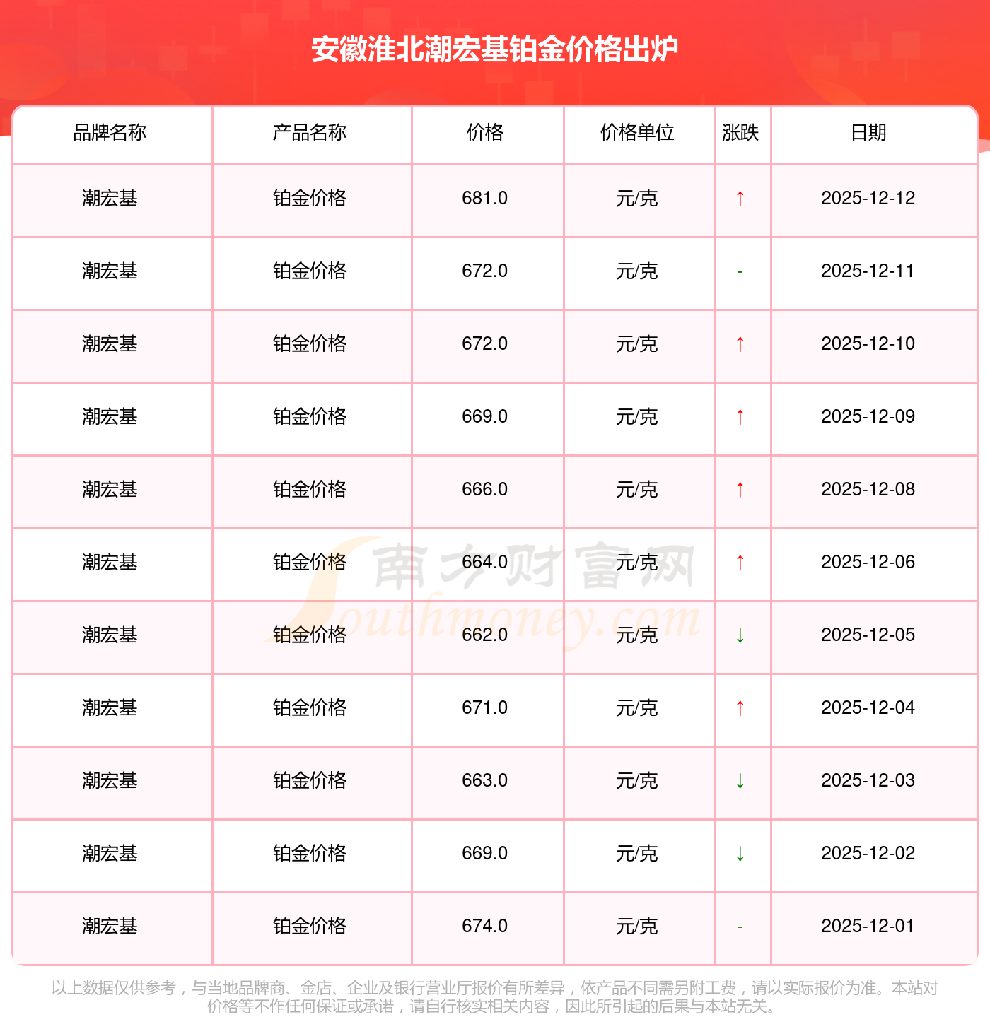 目前,铂金价格报价区间在681.0元/克和364.0元/克之间。最高的为周大福,报价681.0元/克,最低的为萃华金店,报价364.0元/克。今日铂金价格高低差为317元/克。