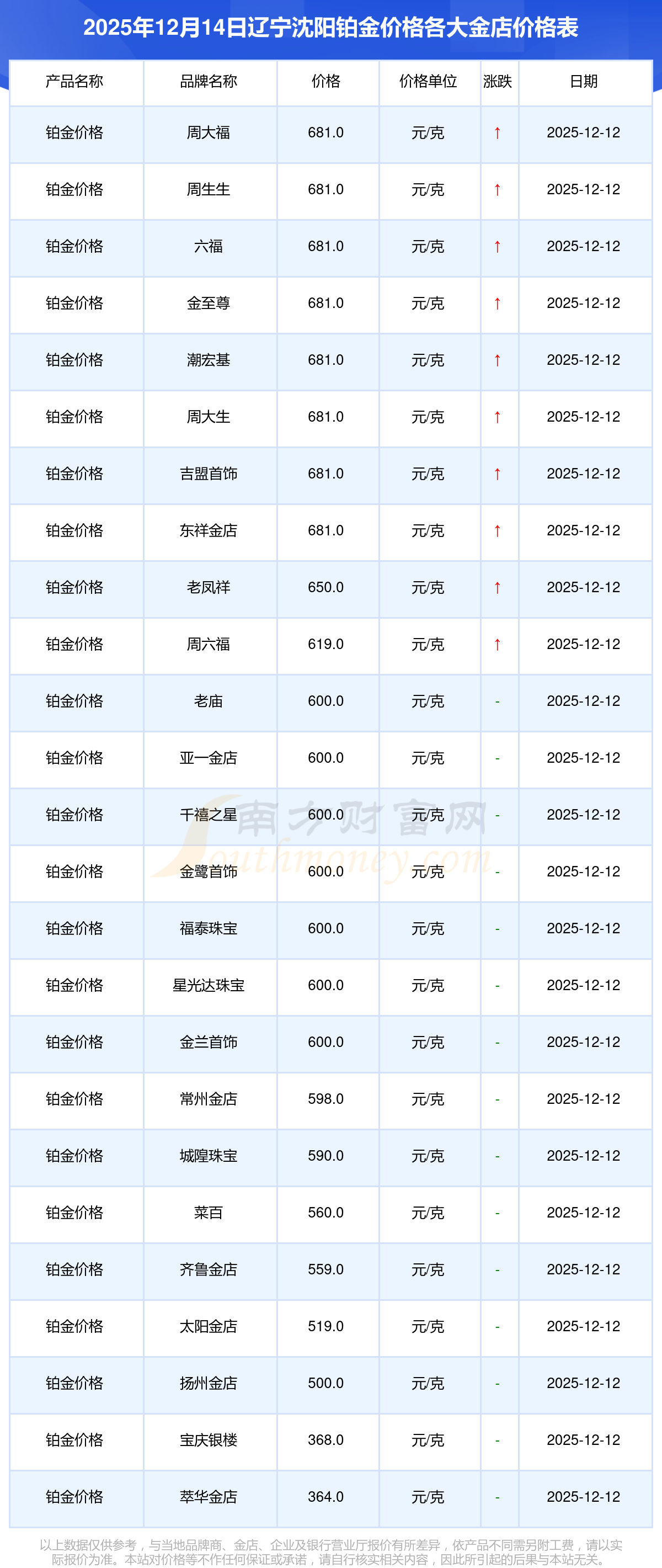 二、2025年12月14日今日辽宁沈阳各金店铂金价格实时查询表
