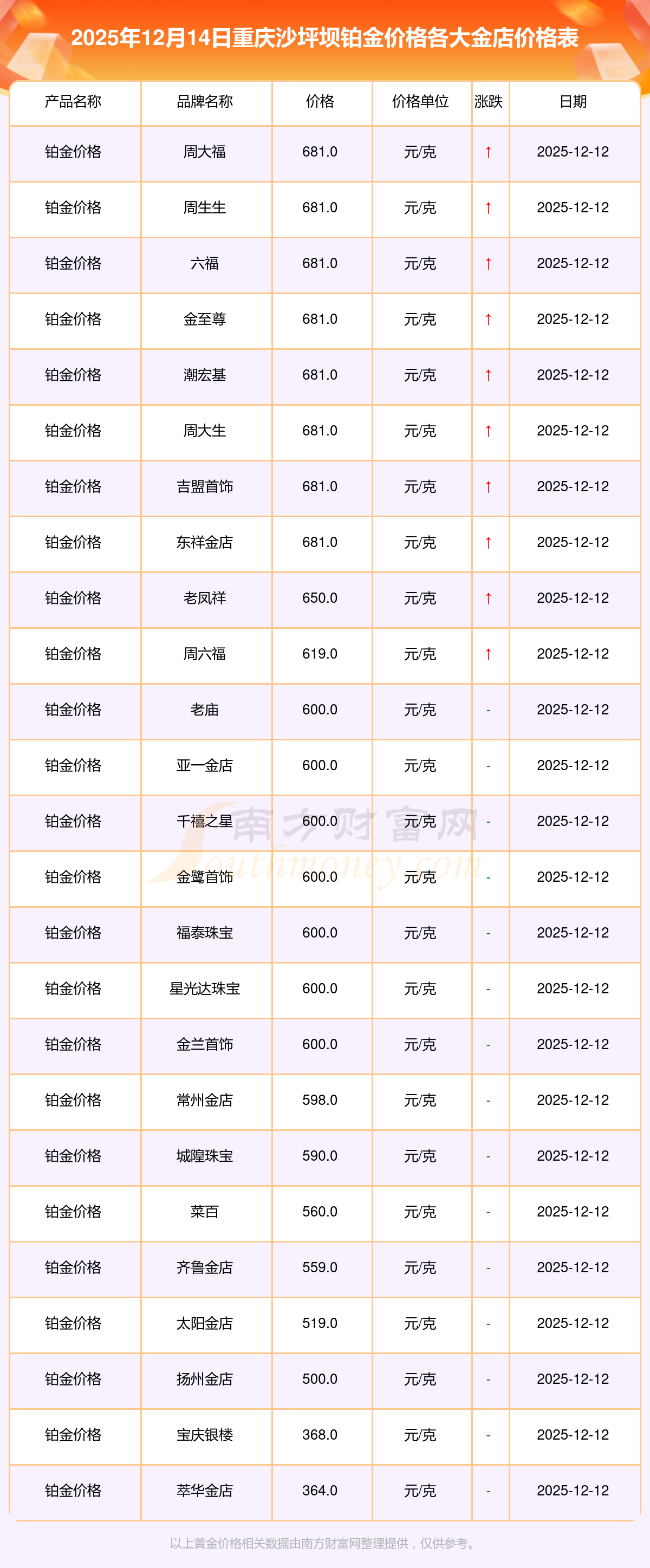 今天是2025年12月14日,重庆沙坪坝周大福、周大福、老凤祥、老凤祥、老庙、老庙、周生生、周生生、周大福、周大福、周大福等各大金店品牌铂金价格最新价格如下:周大福1336.0元/克、周大福681.0元/克、老凤祥1337.0元/克、老凤祥650.0元/克、老庙1339.0元/克、老庙600.0元/克、周生生1338.0元/克、周生生681.0元/克、周大福1336.0元/克、周大福47410.0、周大福19550.0。