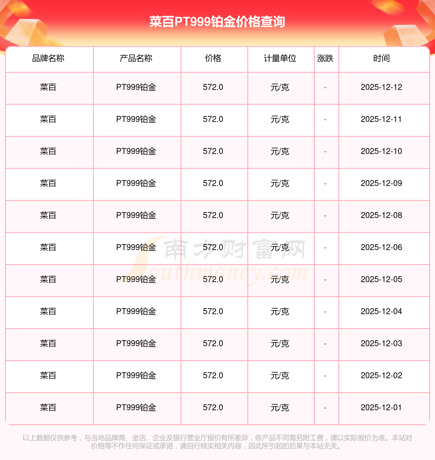 今日菜百 PT999铂金最新的克重售价为572.0元/克。