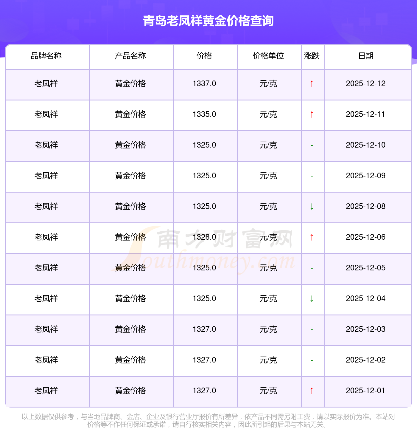 今日(2025年12月14日),青岛老凤祥黄金价格的价格是1337.0元/克。