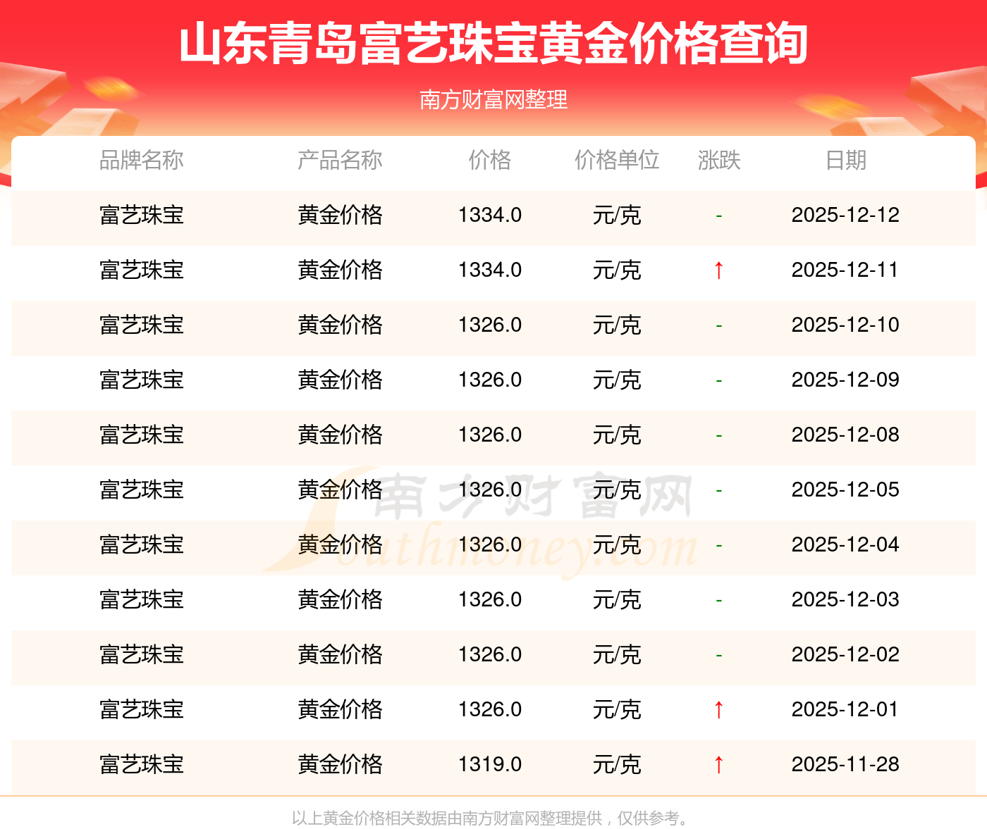 山东青岛富艺珠宝 2025年12月14日的黄金价格价位为 1334.0元/克。