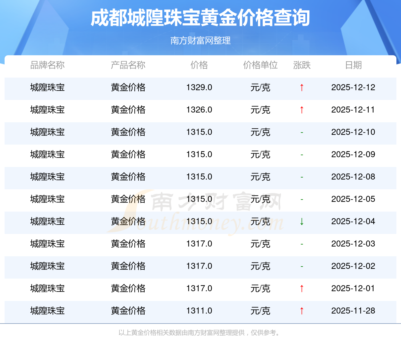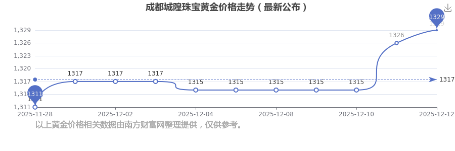 今日(2025年12月14日),成都城隍珠宝黄金价格的价格是1329.0元/克。
