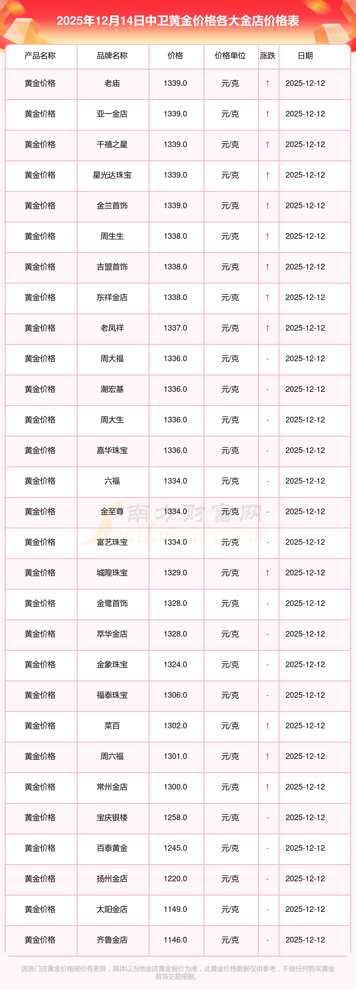 2025年12月14日,中卫周大福、周大福、老凤祥、老凤祥、老庙、老庙、周生生、周生生、周大福、周大福、周大福等各大金店品牌黄金价格今日价格行情最新来了:周大福1336.0元/克、周大福681.0元/克、老凤祥1337.0元/克、老凤祥650.0元/克、老庙1339.0元/克、老庙600.0元/克、周生生1338.0元/克、周生生681.0元/克、周大福1336.0元/克、周大福47410.0、周大福19550.0。