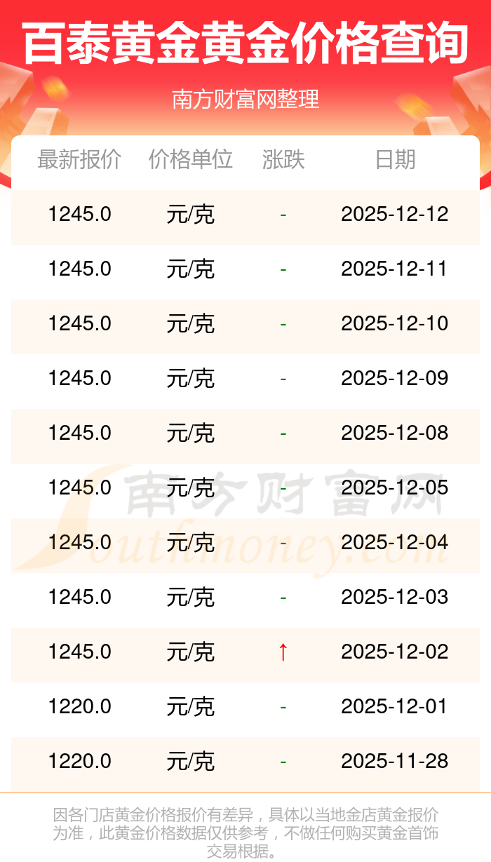 今日黄金价格具体是多少?现在一克黄金卖多少钱?一克黄金的价格会是多少呢?今日(2025年12月14日)百泰黄金黄金价格是1245.0元/克。