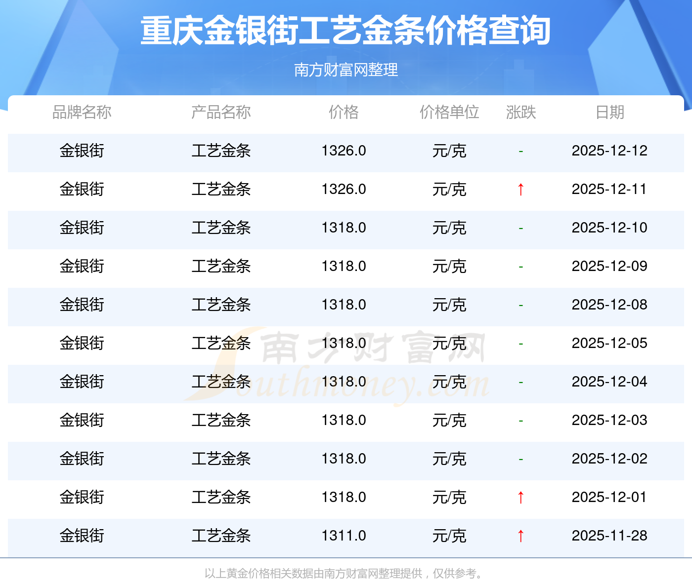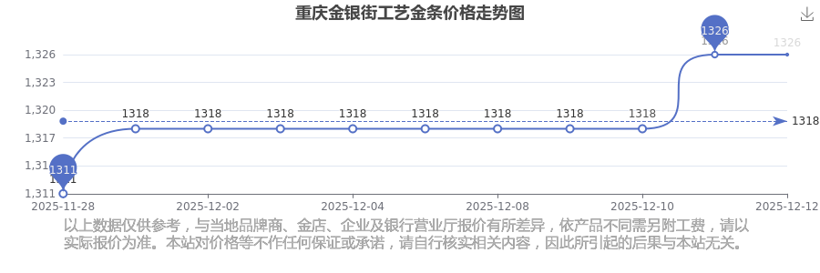 今日重庆金银街工艺金条价格是1326.0元/克。