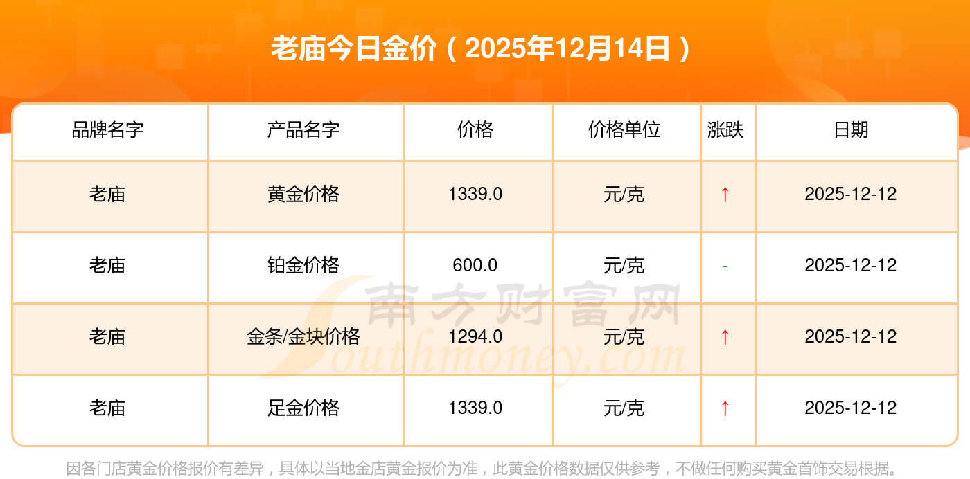 2025年12月14日老庙金价查询:黄金价格1336.0元/克,铂金价格681.0元/克,黄金价格1337.0元/克,铂金价格650.0元/克,黄金价格1339.0元/克,铂金价格600.0元/克,黄金价格1338.0元/克,铂金价格681.0元/克,饰品金价(内地)1336.0元/克,黄金饰品(香港)47410.0,铂金价格(香港)19550.0。