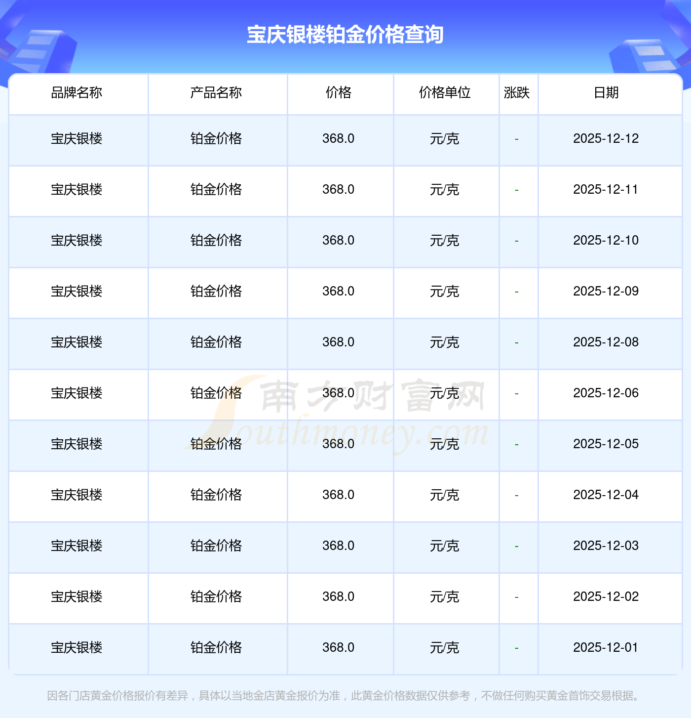 今日宝庆银楼铂金价格最新是368.0元/克。
