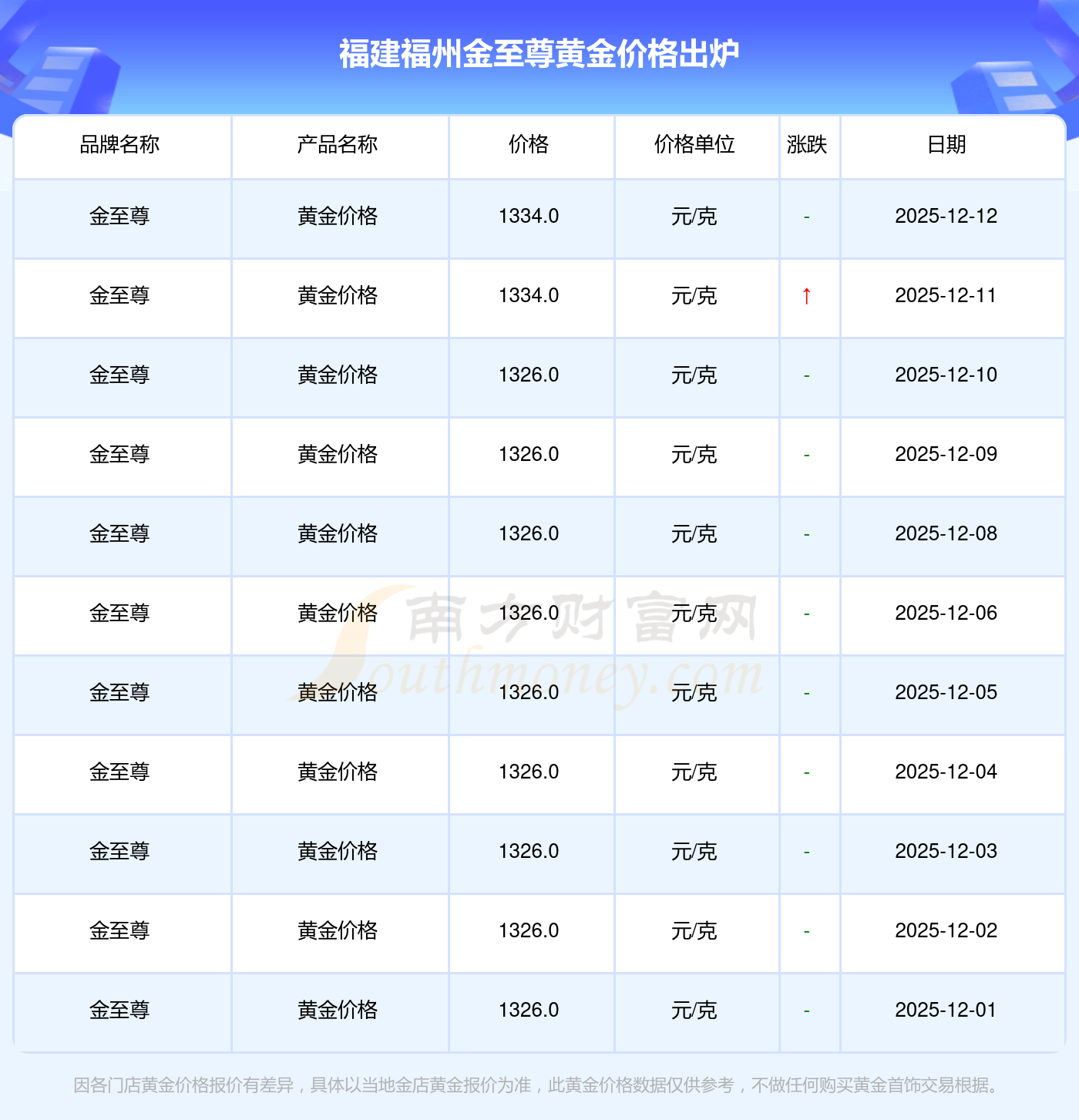 今日(2025年12月14日)福建福州金至尊黄金价格最新价格为1334.0元/克。