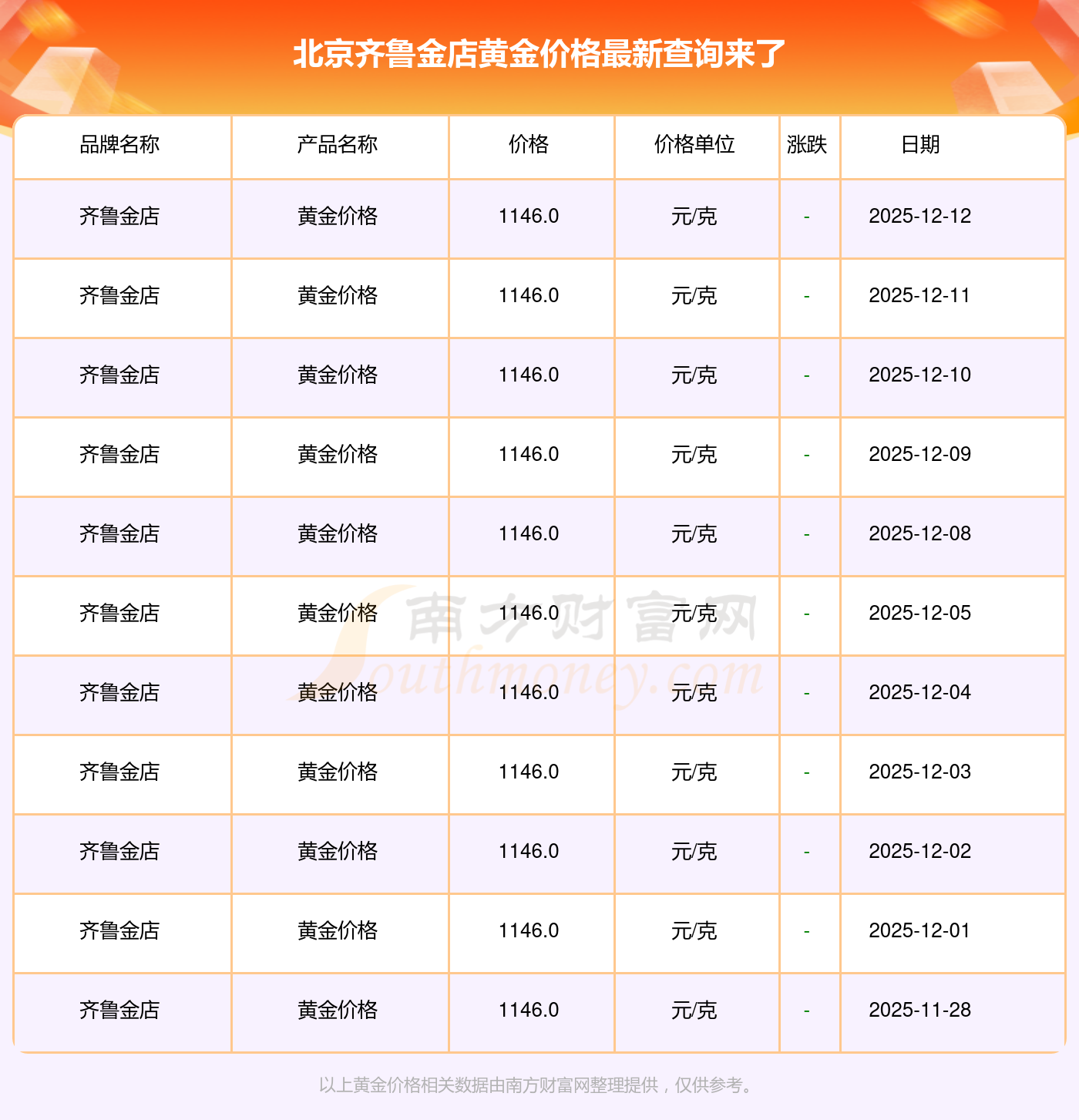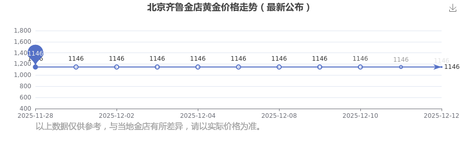 2025年12月14日,北京齐鲁金店黄金价格每克的价值量定格在1146.0元/克。