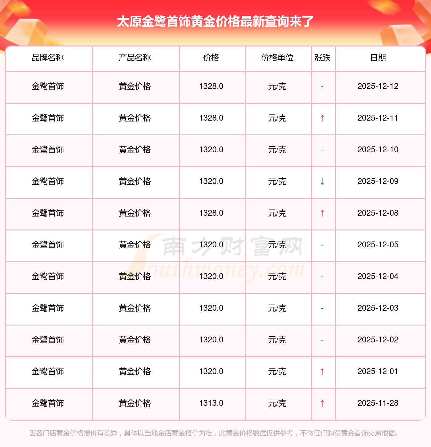 今日(2025年12月14日)太原金鹭首饰黄金价格是1328.0元/克。