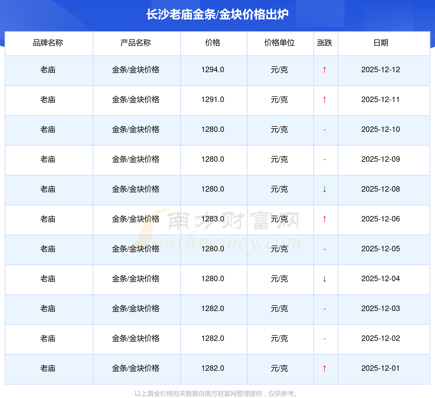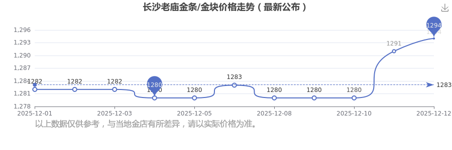今日长沙老庙金条/金块价格最新为:1294.0元/克。
