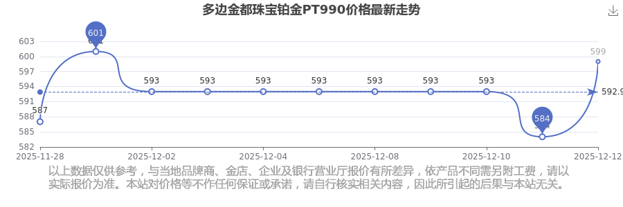 2025年12月14日多边金都珠宝铂金PT990价格最新为599.0元/克。