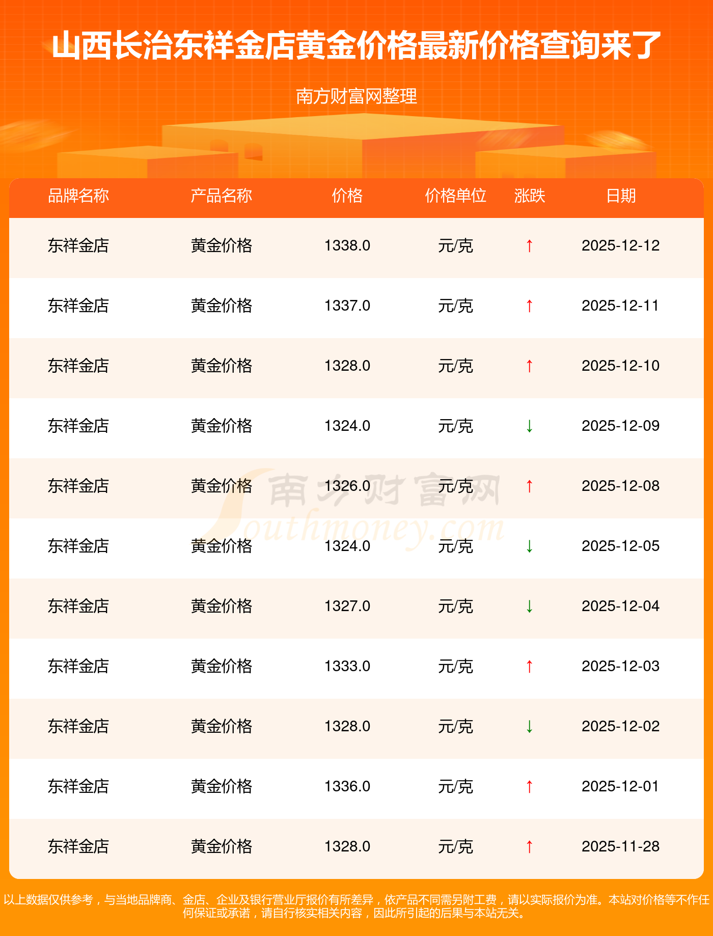 今日山西长治东祥金店黄金价格是1338.0元/克。