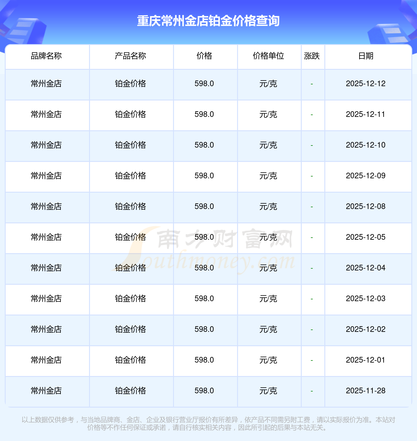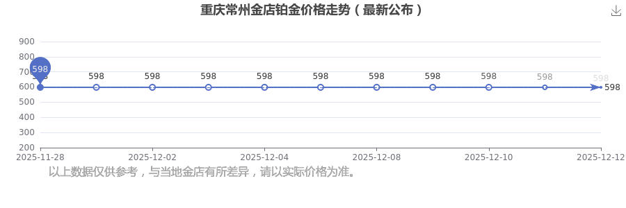 今日重庆常州金店铂金价格最新价格是598.0元/克。
