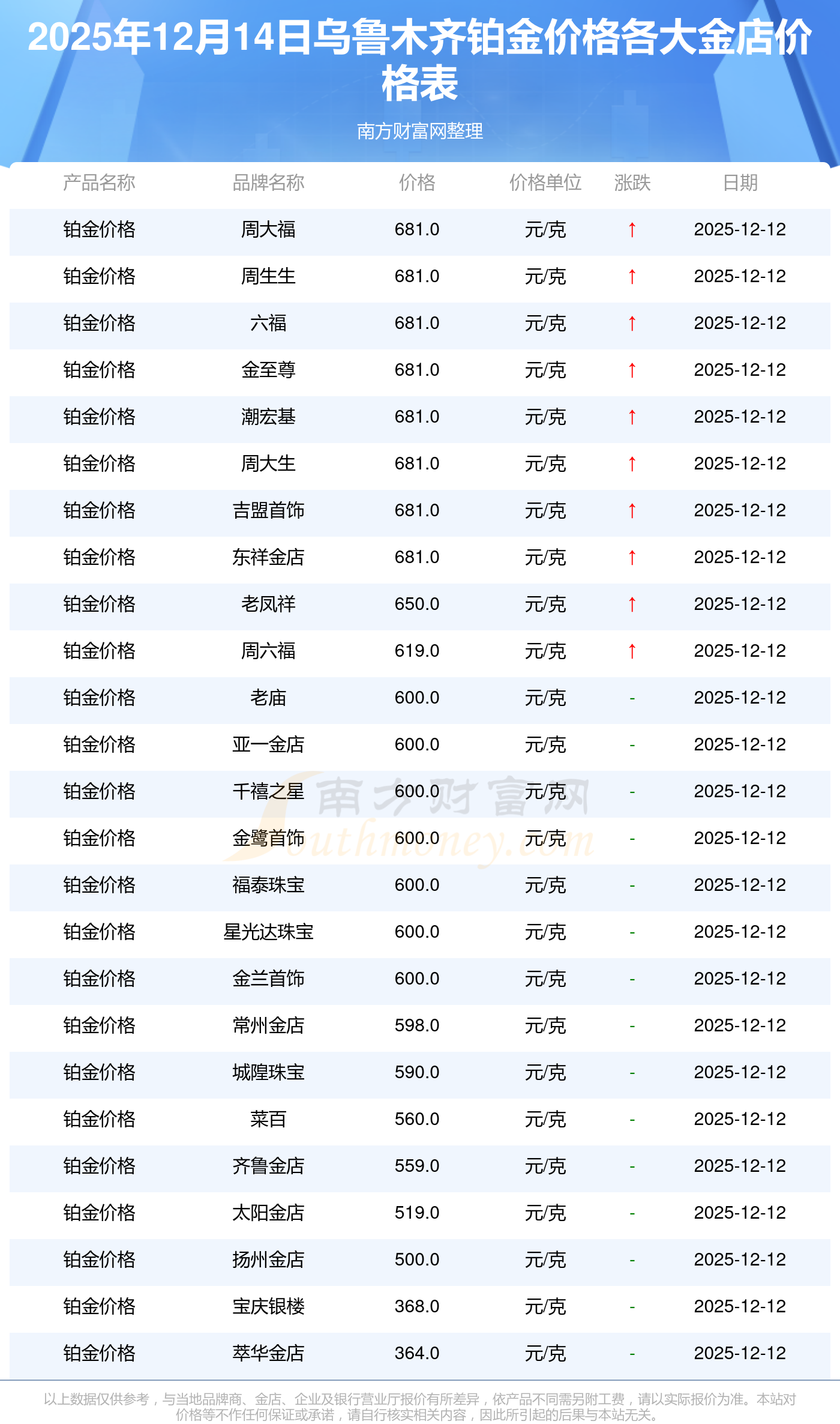 一、乌鲁木齐各金店铂金价格是多少钱?2025年12月14日乌鲁木齐各金店铂金价格汇总