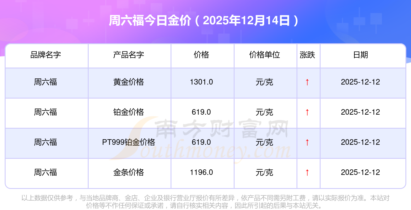 2025年12月14日周六福今日价格:黄金价格1336.0元/克,铂金价格681.0元/克,黄金价格1337.0元/克,铂金价格650.0元/克,黄金价格1339.0元/克,铂金价格600.0元/克,黄金价格1338.0元/克,铂金价格681.0元/克,饰品金价(内地)1336.0元/克,黄金饰品(香港)47410.0,铂金价格(香港)19550.0。