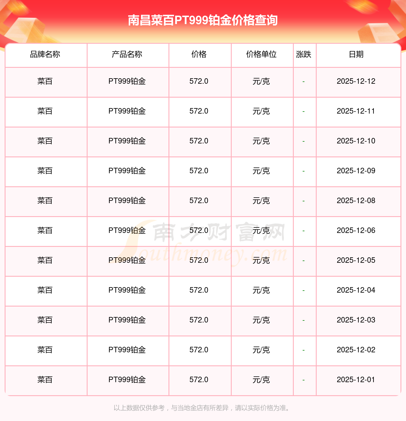 于 2025年12月14日,南昌菜百PT999铂金的克价为572.0元/克。