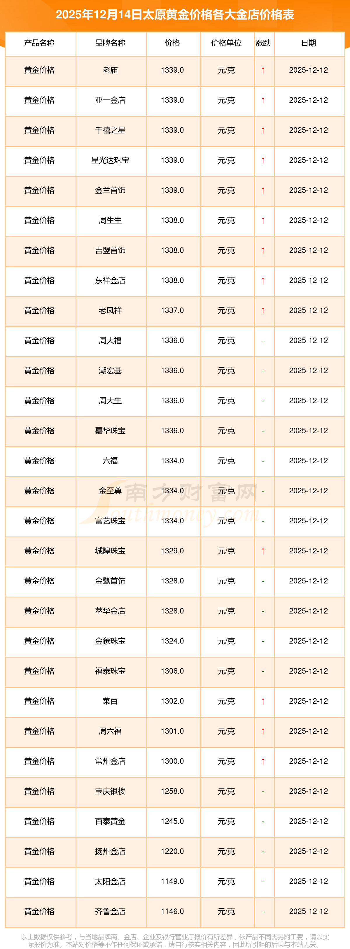 2025年12月14日太原周大福、周大福、老凤祥、老凤祥、老庙、老庙、周生生、周生生、周大福、周大福、周大福等各大金店品牌黄金价格最新价格行情来了,如下:周大福黄金价格1336.0元/克,周大福铂金价格681.0元/克,老凤祥黄金价格1337.0元/克,老凤祥铂金价格650.0元/克,老庙黄金价格1339.0元/克,老庙铂金价格600.0元/克,周生生黄金价格1338.0元/克,周生生铂金价格681.0元/克,周大福饰品金价(内地)1336.0元/克,周大福黄金饰品(香港)47410.0,周大福铂金价格(香港)19550.0。