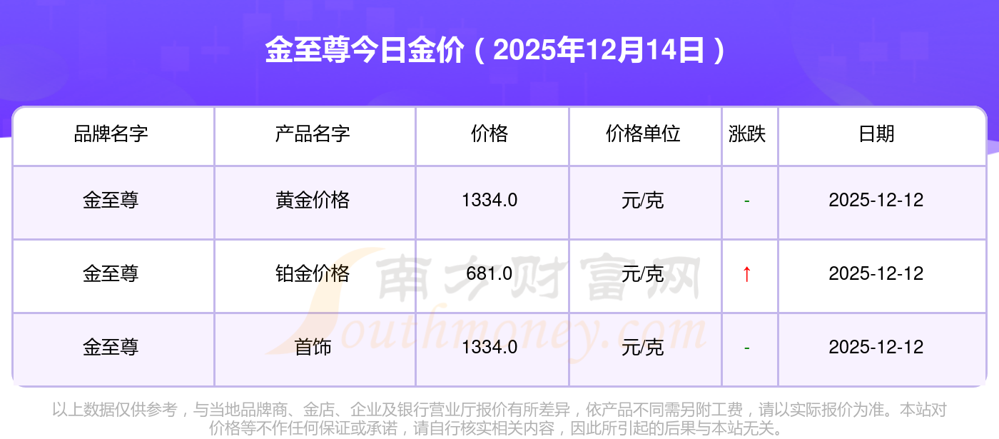 2025年12月14日周大福、周大福、老凤祥、老凤祥、老庙、老庙、周生生、周生生、周大福、周大福、周大福等各大金店品牌黄金价格最新价格如下:周大福黄金价格1336.0元/克,周大福铂金价格681.0元/克,老凤祥黄金价格1337.0元/克,老凤祥铂金价格650.0元/克,老庙黄金价格1339.0元/克,老庙铂金价格600.0元/克,周生生黄金价格1338.0元/克,周生生铂金价格681.0元/克,周大福饰品金价(内地)1336.0元/克,周大福黄金饰品(香港)47410.0,周大福铂金价格(香港)19550.0。