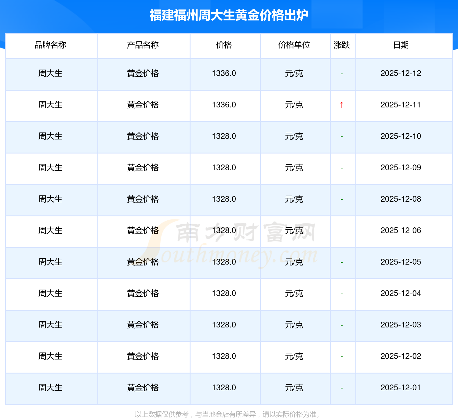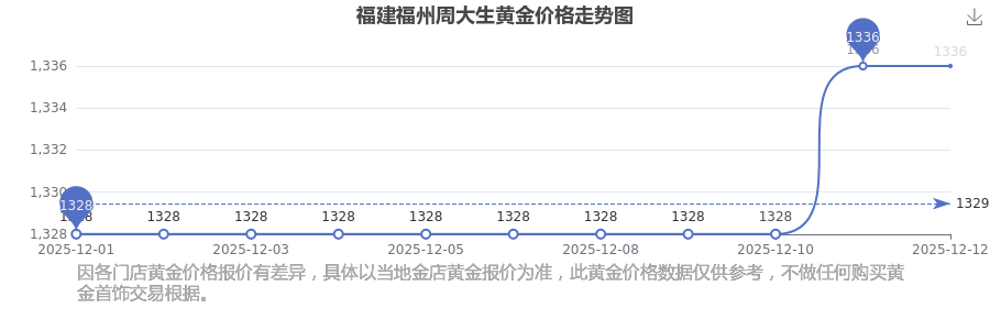 福建福州周大生黄金价格现在每克多少钱,今日黄金一克的标价是多少?今日福建福州周大生黄金价格查询,2025年12月14日,福建福州周大生所售黄金价格,其价格设定为 1336.0元/克。
