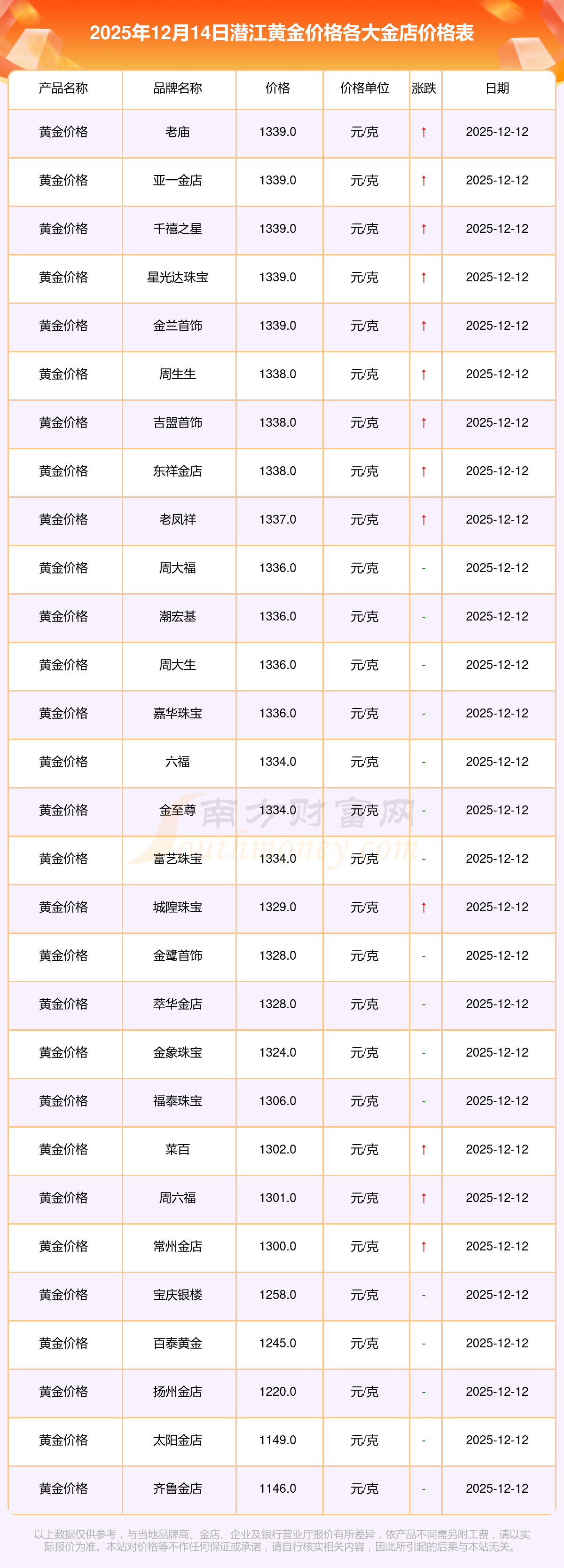 今天是2025年12月14日,潜江周大福、周大福、老凤祥、老凤祥、老庙、老庙、周生生、周生生、周大福、周大福、周大福等各大金店品牌黄金价格最新价格行情是这样的:周大福1336.0元/克、周大福681.0元/克、老凤祥1337.0元/克、老凤祥650.0元/克、老庙1339.0元/克、老庙600.0元/克、周生生1338.0元/克、周生生681.0元/克、周大福1336.0元/克、周大福47410.0、周大福19550.0。