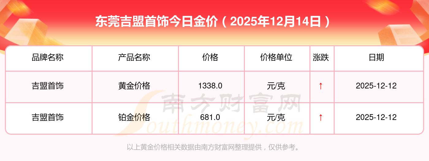 2025年12月14日东莞吉盟首饰黄金一克的市场行情价是多少?黄金价格1336.0元/克,铂金价格681.0元/克,黄金价格1337.0元/克,铂金价格650.0元/克,黄金价格1339.0元/克,铂金价格600.0元/克,黄金价格1338.0元/克,铂金价格681.0元/克,饰品金价(内地)1336.0元/克,黄金饰品(香港)47410.0,铂金价格(香港)19550.0。