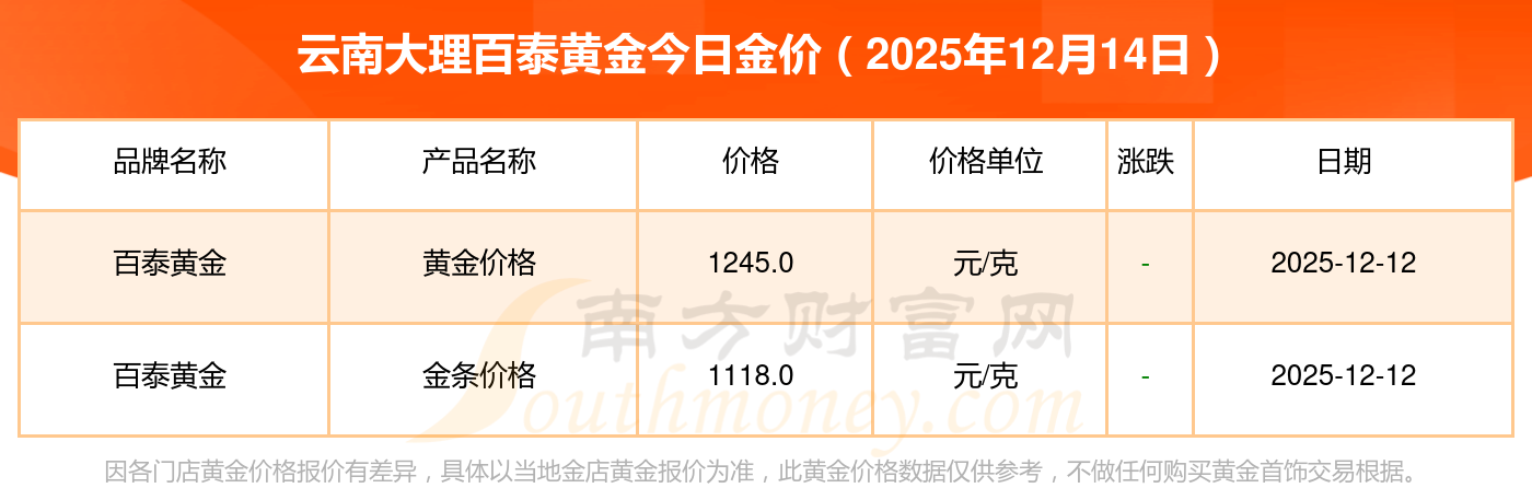 2025年12月14日云南大理百泰黄金一克黄金对应的价格是多少?黄金价格1336.0元/克,铂金价格681.0元/克,黄金价格1337.0元/克,铂金价格650.0元/克,黄金价格1339.0元/克,铂金价格600.0元/克,黄金价格1338.0元/克,铂金价格681.0元/克,饰品金价(内地)1336.0元/克,黄金饰品(香港)47410.0,铂金价格(香港)19550.0。