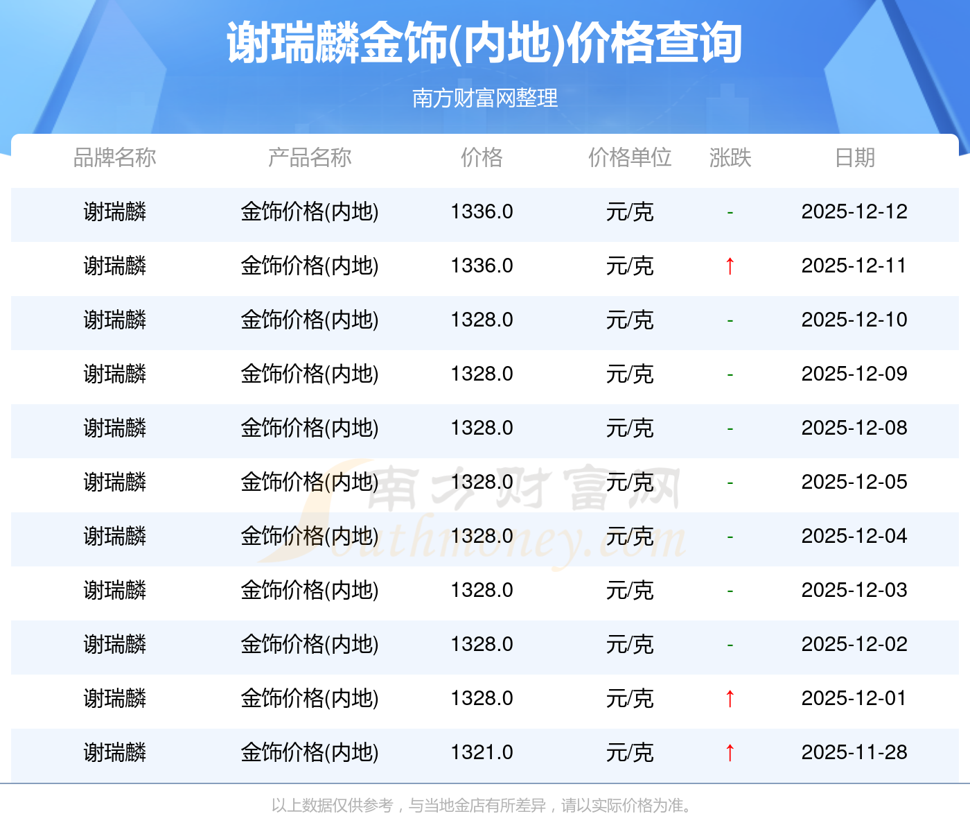 今日(2025年12月14日)谢瑞麟金饰价格(内地)的价格为1336.0元/克。