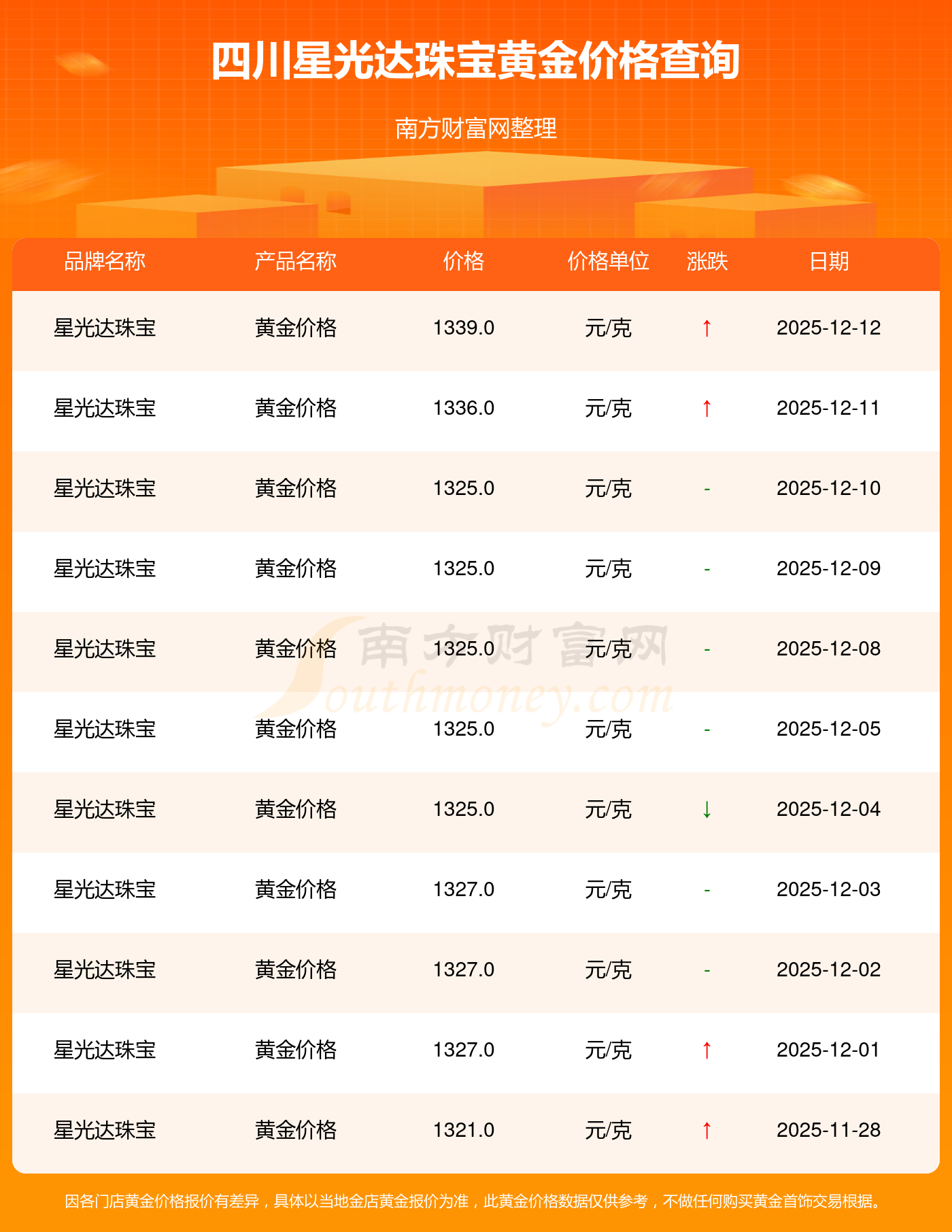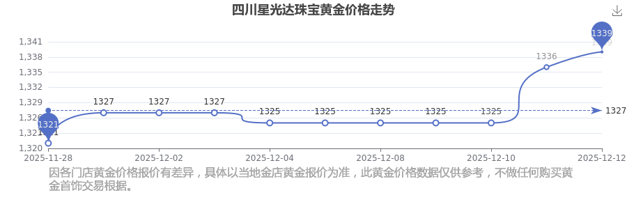 今日(2025年12月14日),四川星光达珠宝黄金价格的定价为 1339.0元/克。