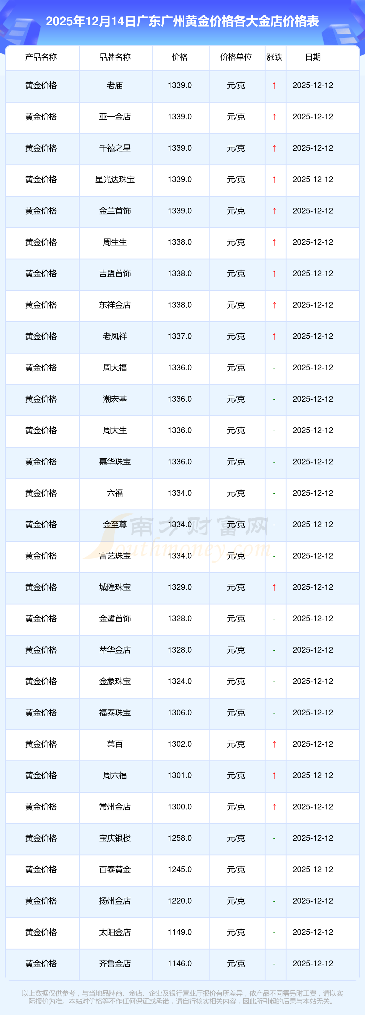 广东广州各大金店黄金价格表来了-2025年12月14日广东广州各大金店黄金价格多少钱一克?