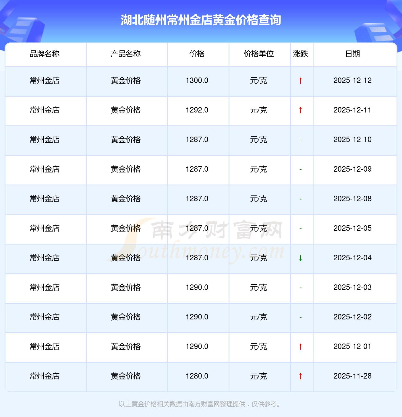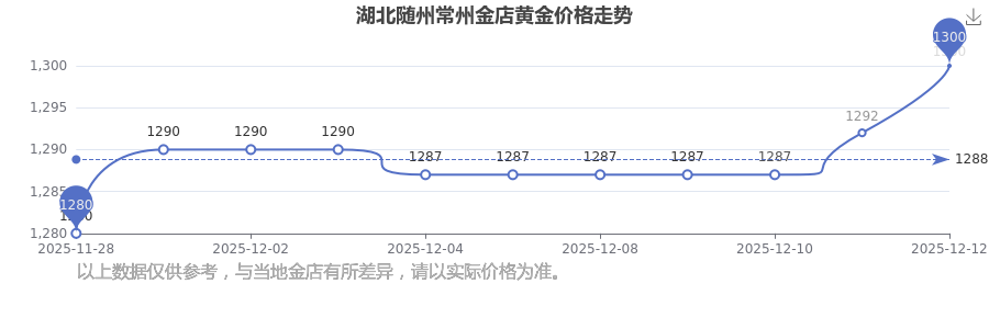 2025年12月14日,湖北随州常州金店所售黄金价格,其价格设定为 1300.0元/克。