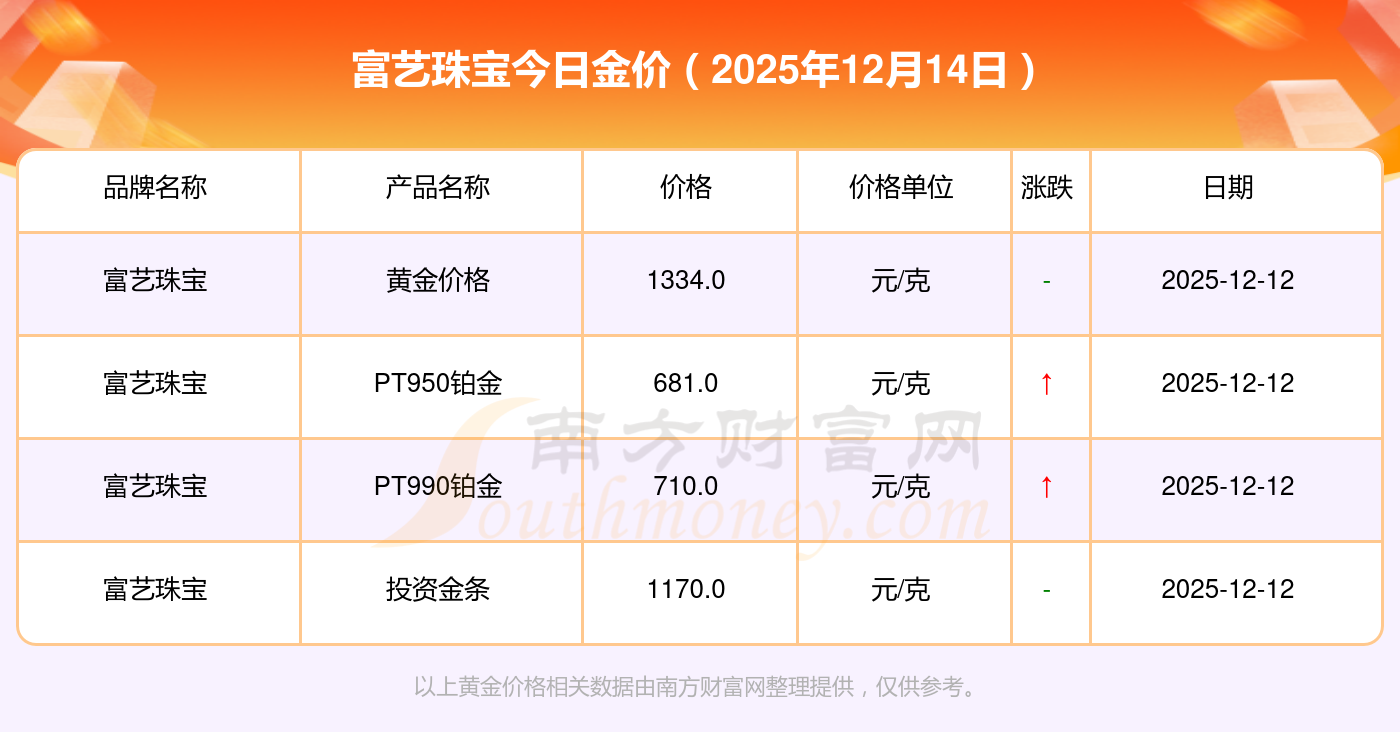 富艺珠宝现在金价多少钱一克?富艺珠宝今天黄金价格多少一克?最新富艺珠宝查询,2025年12月14日富艺珠宝黄金价格现在每克多少钱?最新富艺珠宝黄金价格报价公布,一起来看看吧!