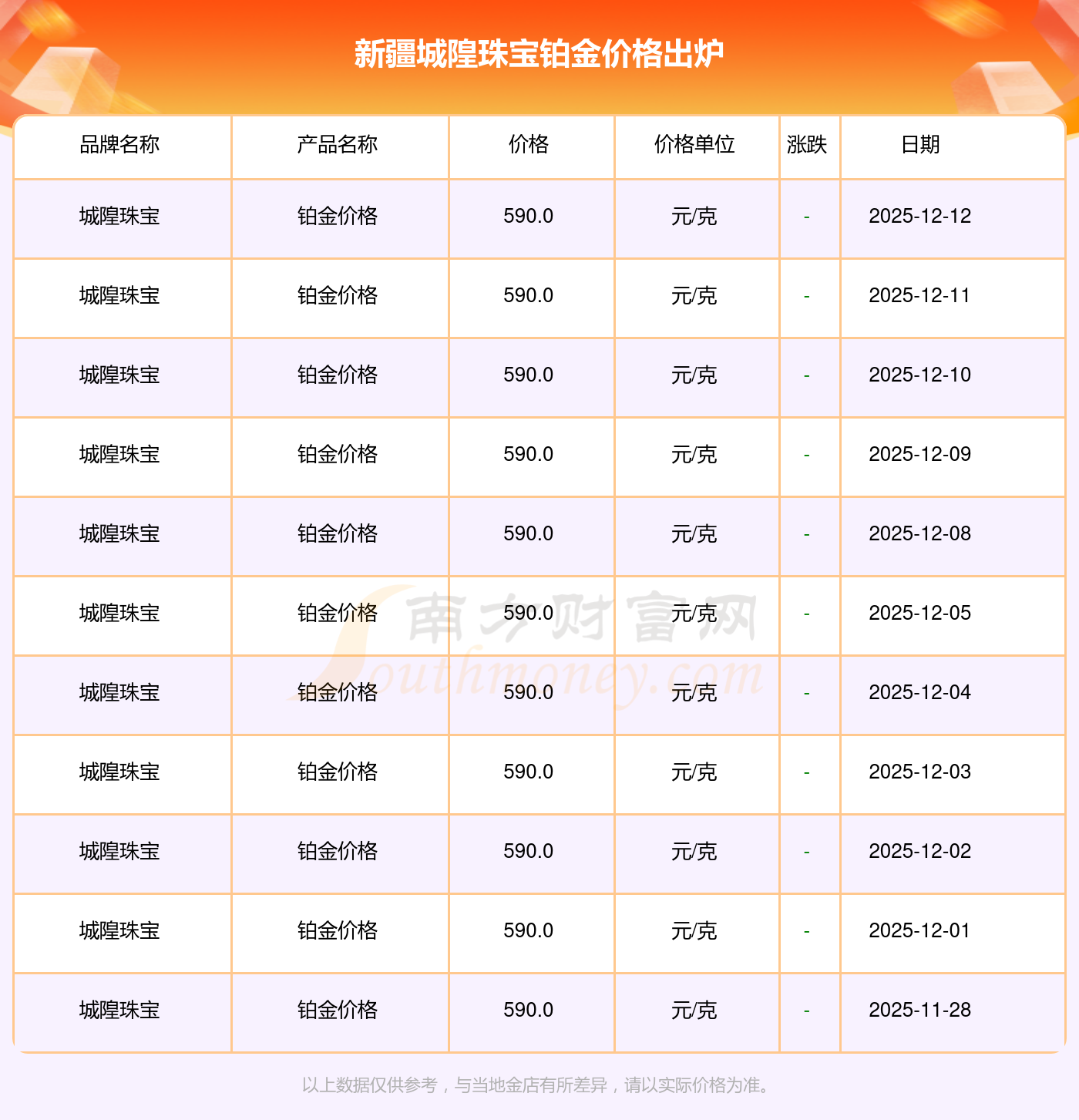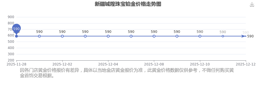 2025年12月14日,新疆城隍珠宝铂金价格每克的价值量定格在590.0元/克。
