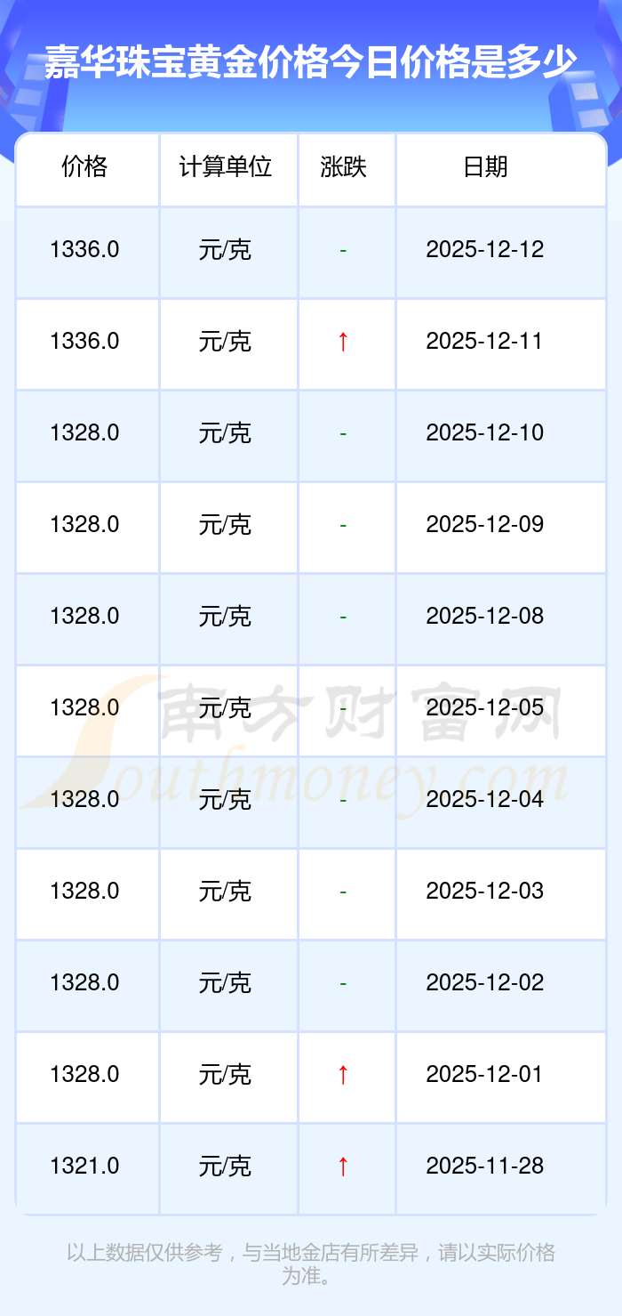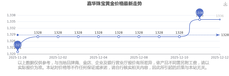 今天黄金价格几何?现在每克黄金值多少钱?黄金是一种优良的导电导热材料,具有良好的导热特性。黄金常用于电子工业中的特殊电路设计,因其化学稳定性高、抗氧化性强,可制作高精度电子元件。2025年12月14日嘉华珠宝黄金价格最新是1336.0元/克。