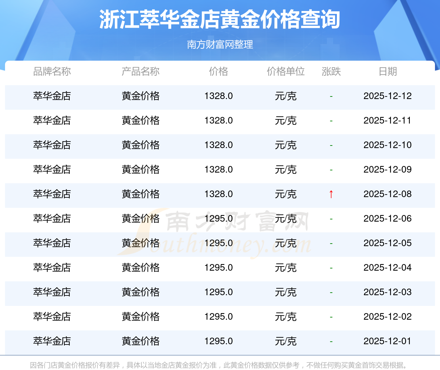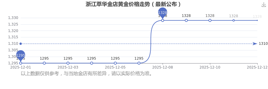 今天黄金每克能卖多少钱?今日浙江萃华金店黄金价格查询,今日(2025年12月14日),1328.0元/克是浙江萃华金店黄金价格的价格标准。