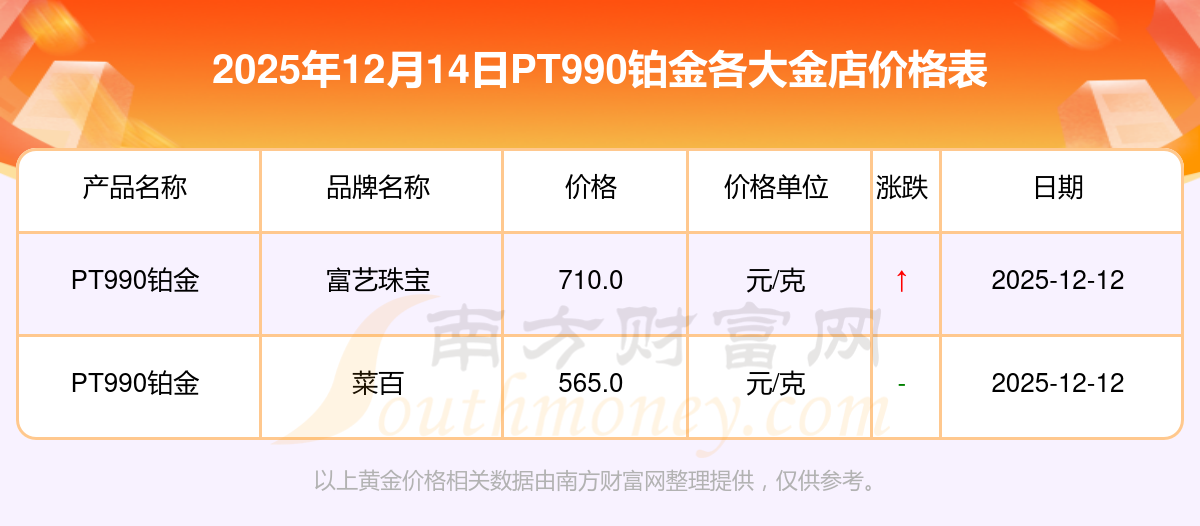 2025年12月14日各大金店PT990铂金最新价格:周大福1336.0元/克,周大福681.0元/克,老凤祥1337.0元/克,老凤祥650.0元/克,老庙1339.0元/克,老庙600.0元/克,周生生1338.0元/克,周生生681.0元/克,周大福1336.0元/克,周大福47410.0,周大福19550.0。