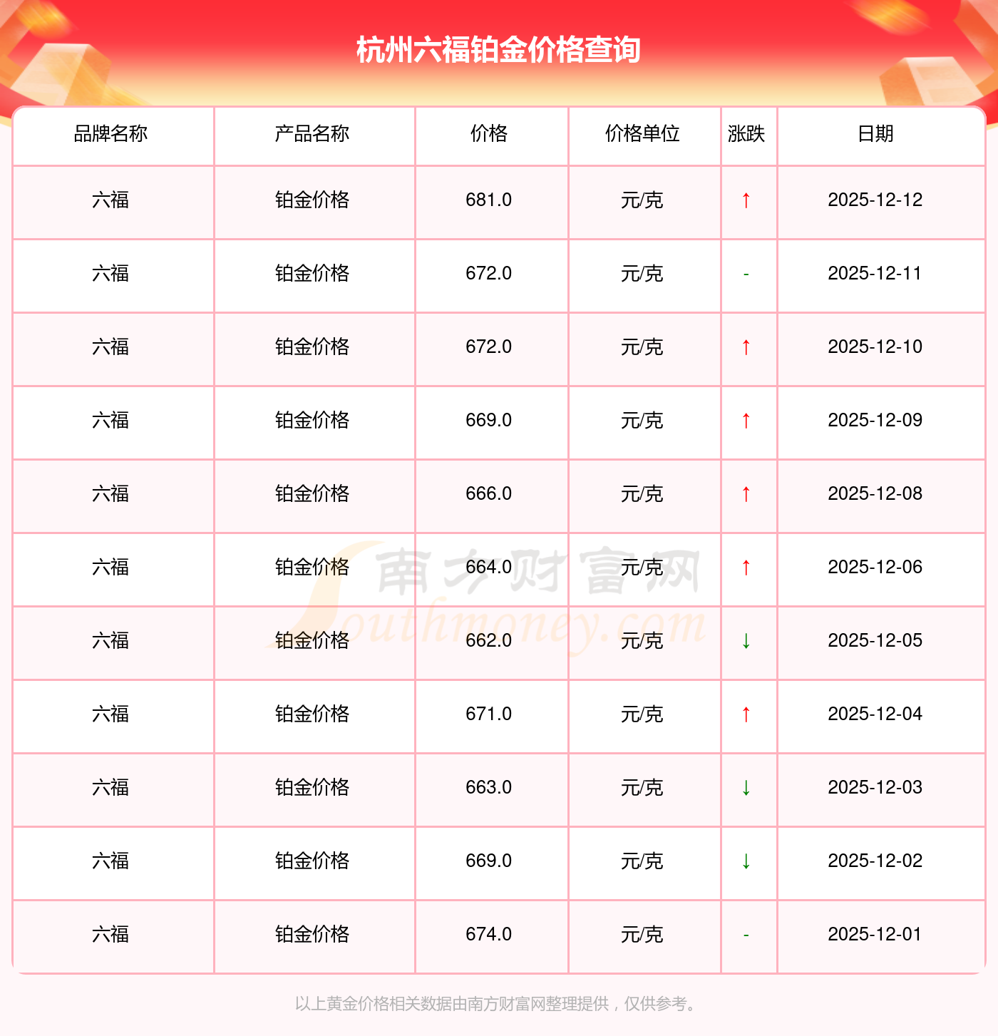 2025年12月14日各大金店铂金价格最新价格:周大福1336.0元/克,周大福681.0元/克,老凤祥1337.0元/克,老凤祥650.0元/克,老庙1339.0元/克,老庙600.0元/克,周生生1338.0元/克,周生生681.0元/克,周大福1336.0元/克,周大福47410.0,周大福19550.0。